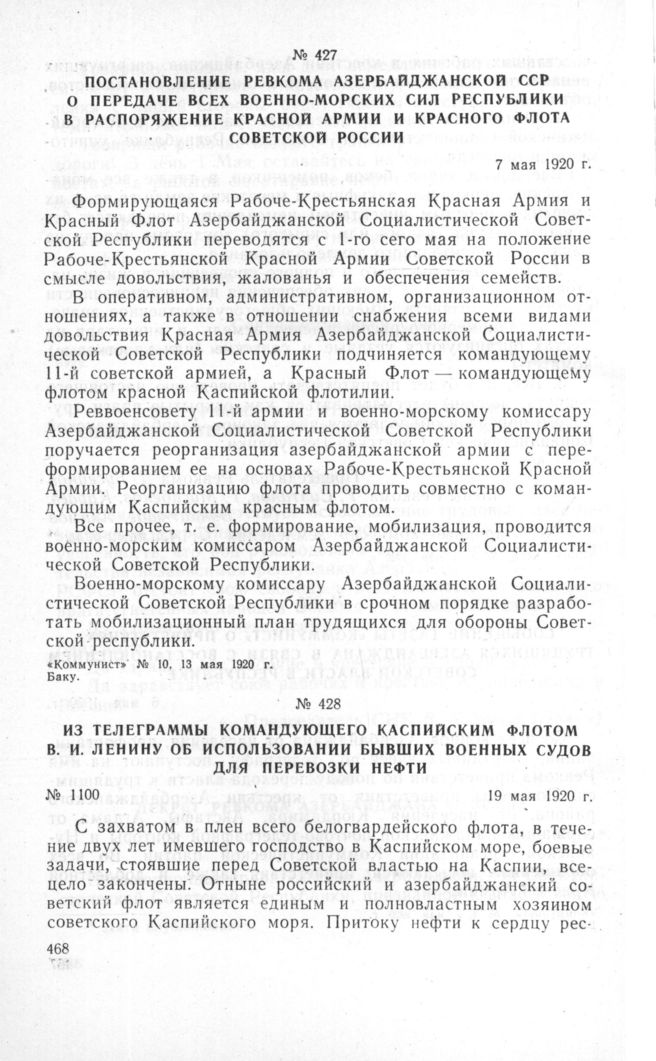 Постановление Ревкома Азербайджанской ССР о передаче всех военно-морских сил республики в распоряжение Красной армии и Красного флота Советской России. 7 мая 1920 г.