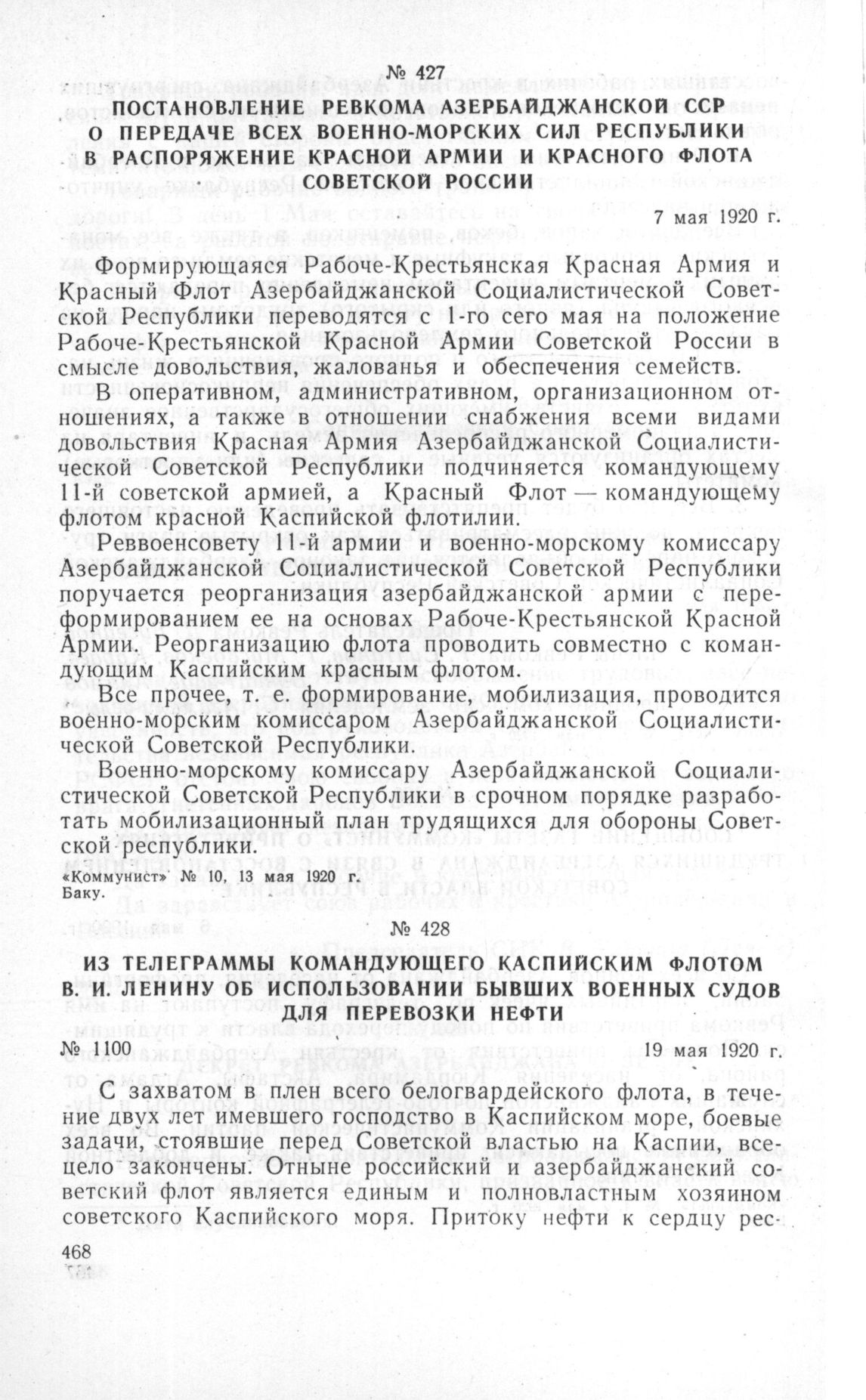 Постановление Ревкома Азербайджанской ССР о передаче всех военно-морских сил республики в распоряжение Красной армии и Красного флота Советской России. 7 мая 1920 г. // «Коммунист» № 10, 13 мая 1920 г. Баку.