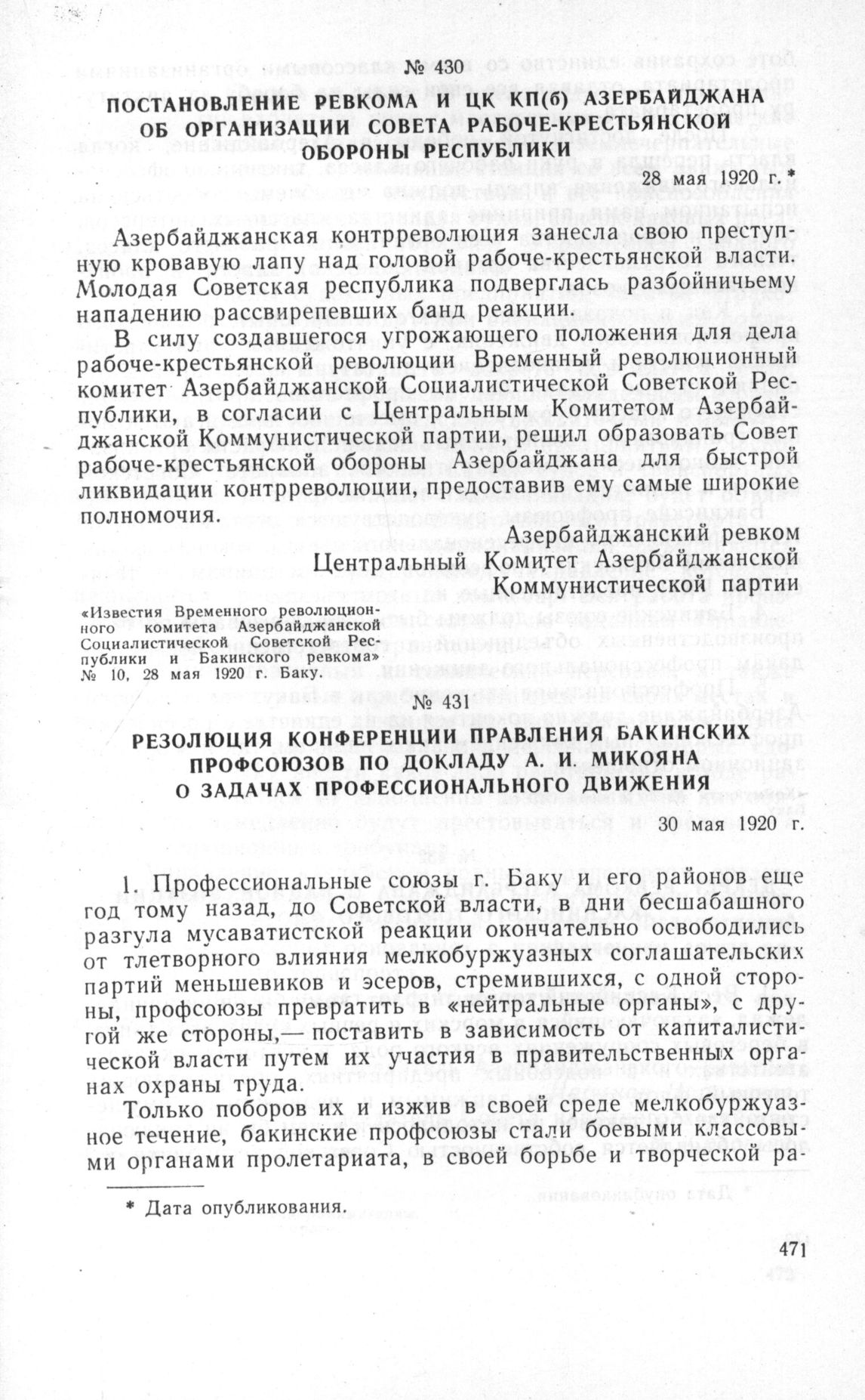 Постановление Ревкома и ЦК КП(б) Азербайджана об организации Совета Рабоче-Крестьянской Обороны Республики. 28 мая 1920 г. // «Известия Временного революционного комитета Азербайджанской Социалистической Советской Республики и Бакинского ревкома». № 10, 28 мая 1920 г. Баку.