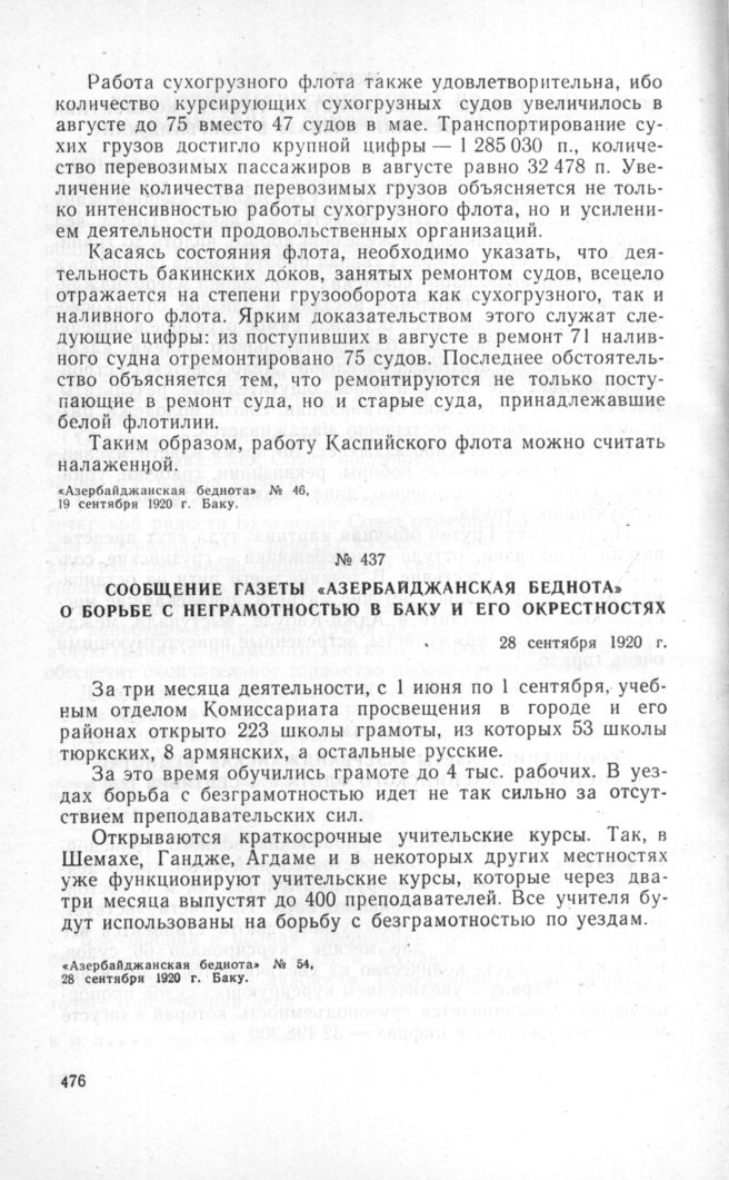 Сообщение газеты «Азербайджанская беднота» о борьбе с неграмотностью в Баку и его окрестностях. 28 сентября 1920 г. // «Азербайджанская беднота» № 54, 28 сентября 1920 г. Баку.