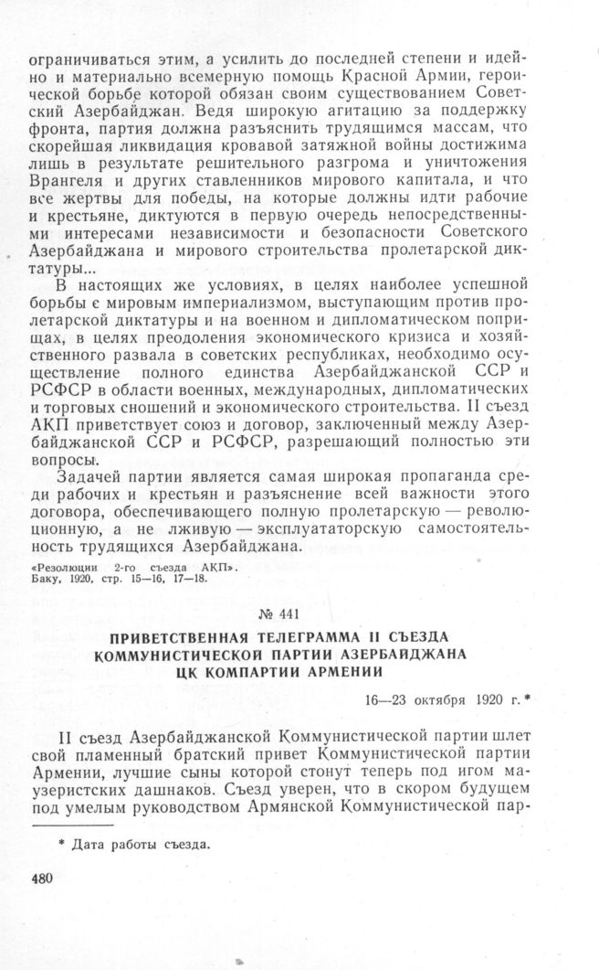 Приветственная телеграмма II съезда Коммунистической партии Азербайджана ЦК Компартии Армении. 16-23 октября 1920 г.