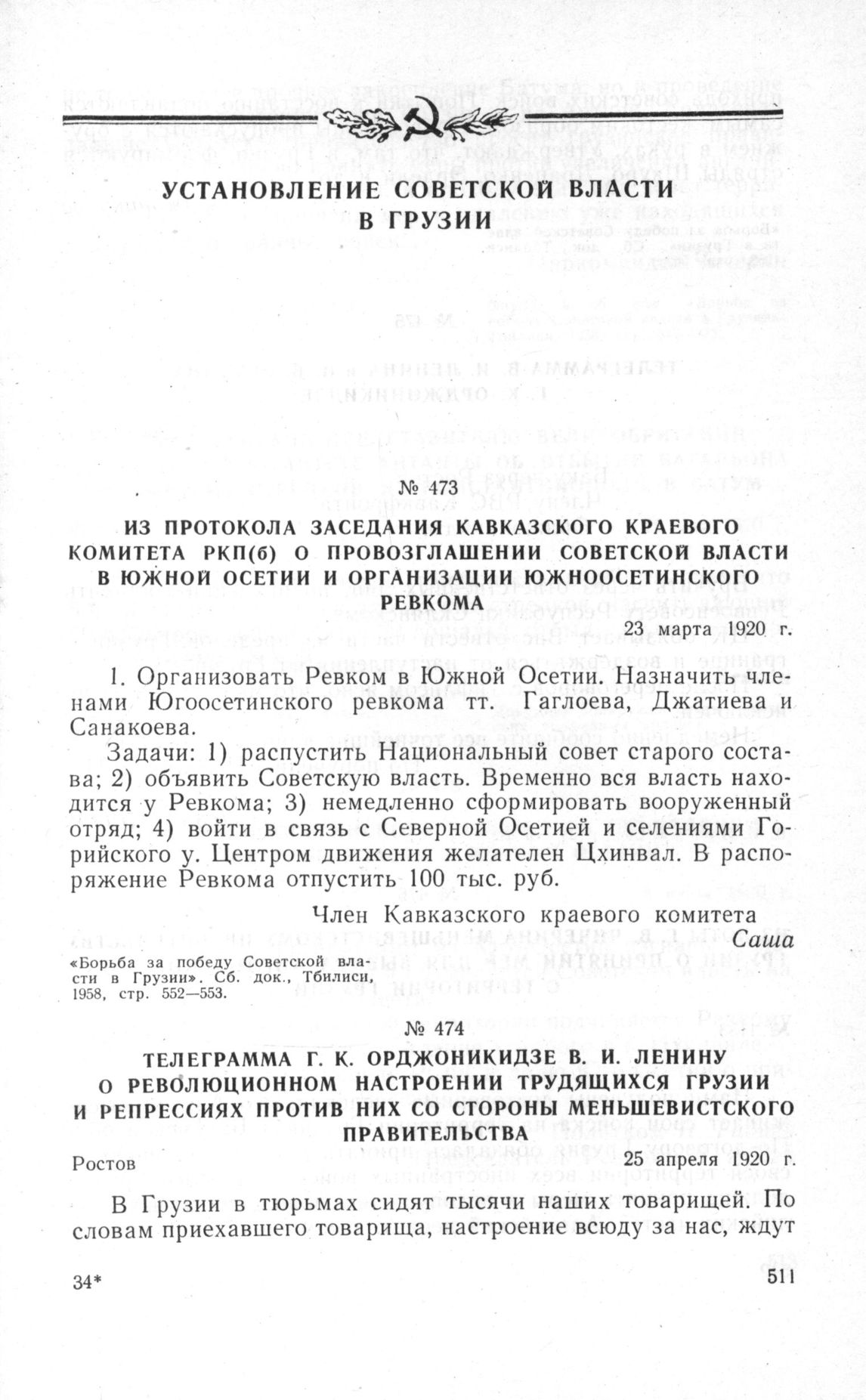Из протокола заседания Кавказского краевого комитета РКП(б) о провозглашении Советской власти в Южной Осетии и организации Южноосетинского Ревкома. 23 марта 1920 г. // «Борьба за победу Советской власти в Грузии». Сб. док., Тбилиси, 1958, стр. 552-553.