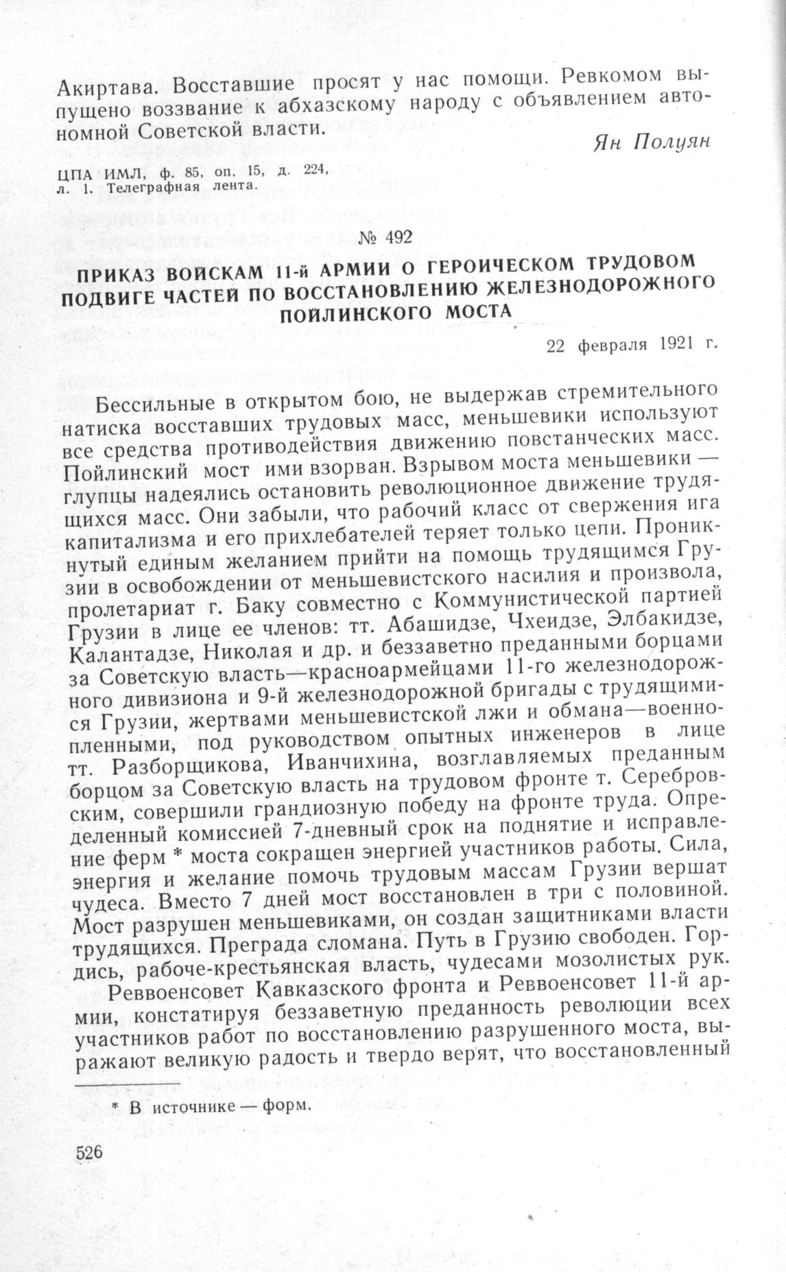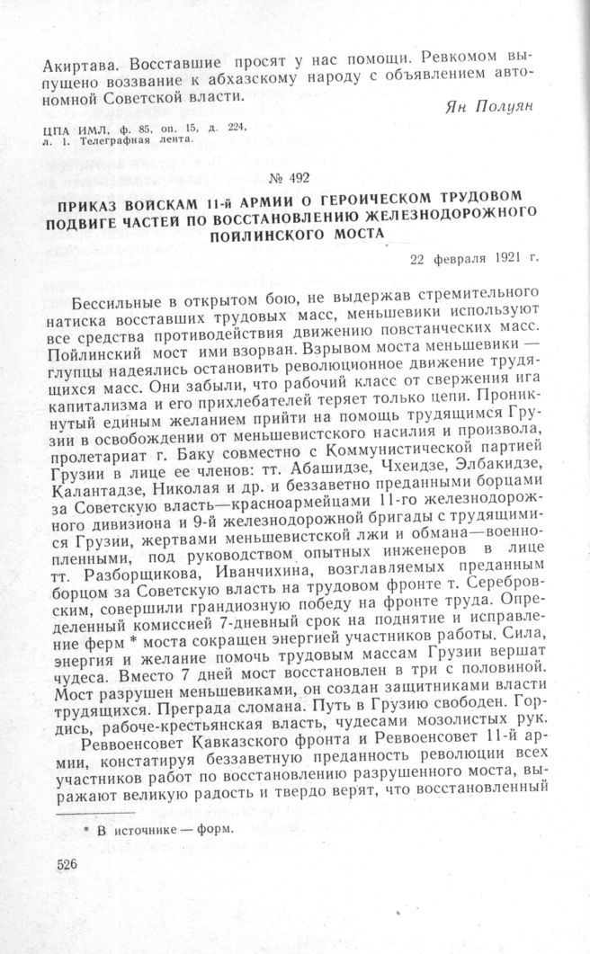 Приказ войскам 11-й Армии о героическом трудовом подвиге частей по восстановлению железнодорожного Пойлинского моста. 22 февраля 1921 г.