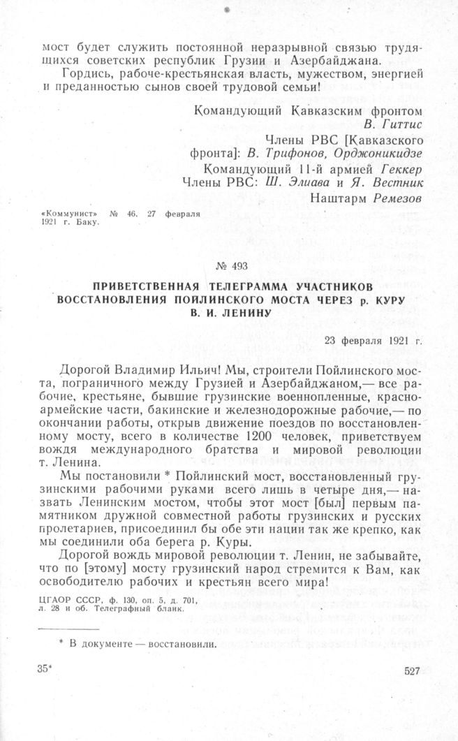 Приветственная телеграмма участников восстановления Пойлинского моста через р. Куру В.И. Ленину. 23 февраля 1921 г.