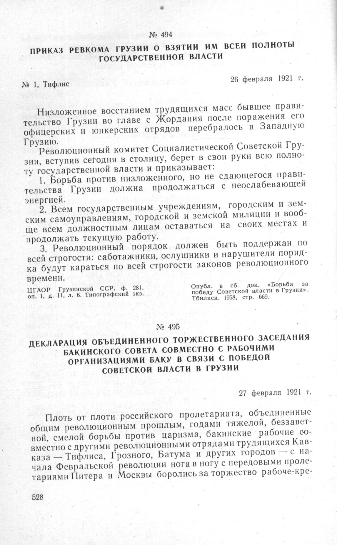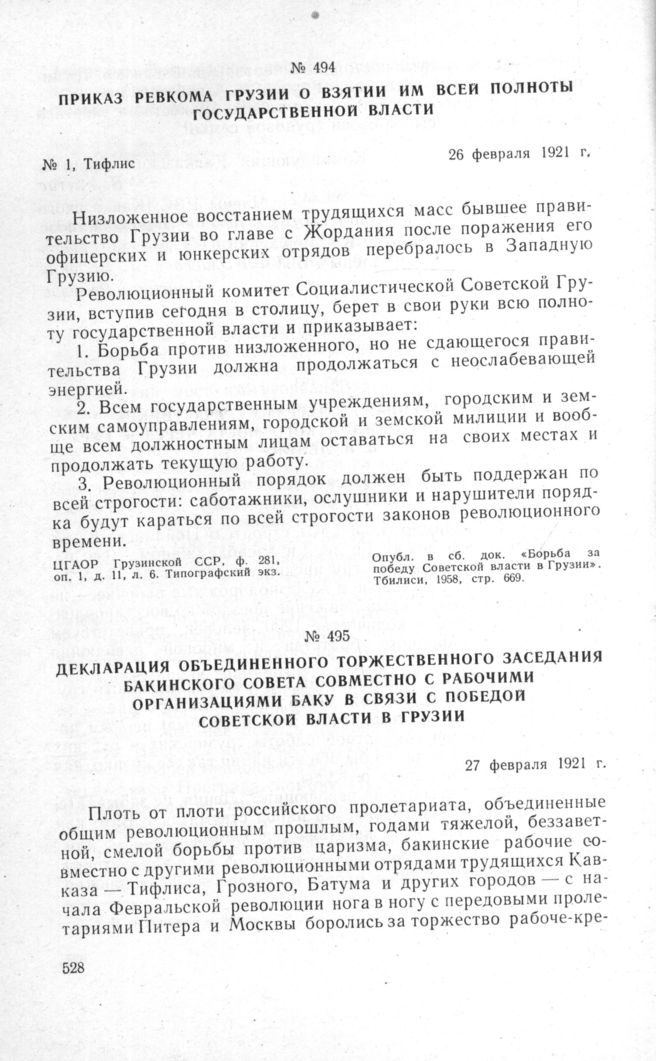 Декларация объединенного торжественного заседания Бакинского Совета совместно с рабочими организациями Баку в связи с победой Советской власти в Грузии. 27 февраля 1921 г. // «Правда Грузии» № 6, 8 марта 1921 г. Тифлис.
