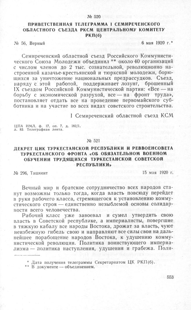 Приветственная телеграмма I Семиреченского областного съезда РКСМ Центральному Комитету РКП(б). Верный, 6 мая 1920 г.