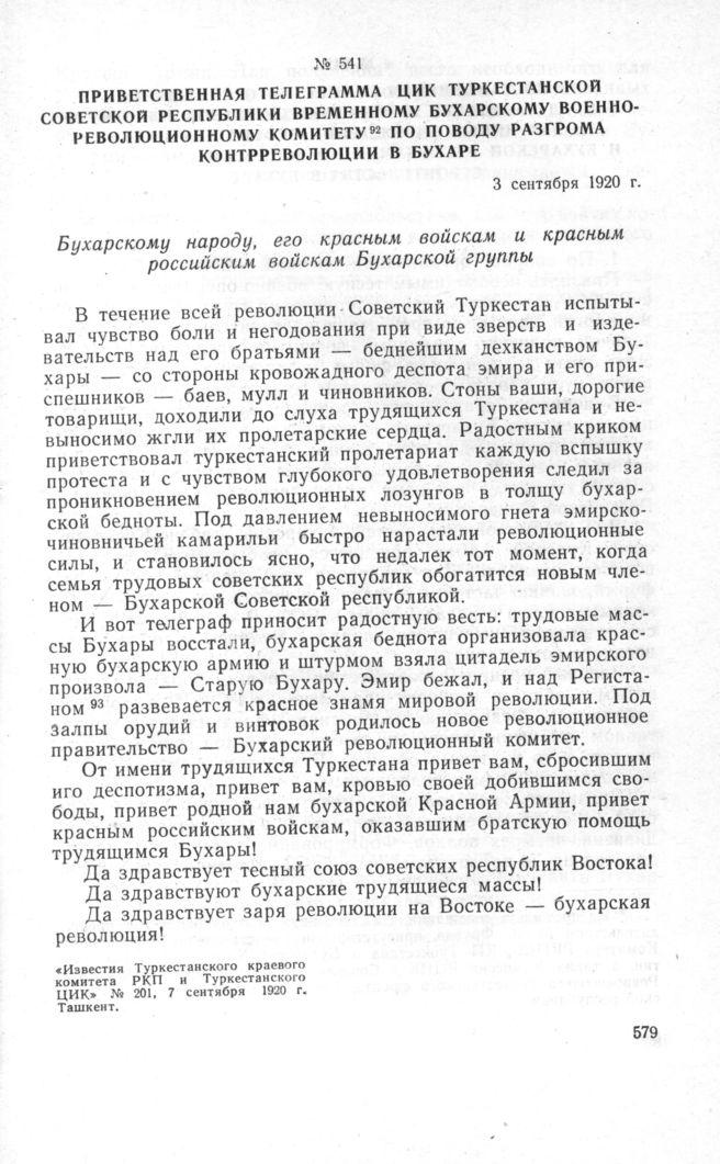 Приветственная телеграмма ЦИК Туркестанской Советской Республики временному Бухарскому Военно-Революционному комитету по поводу разгрома контрреволюции в Бухаре. 3 сентября 1920 г. // «Известия Туркестанского краевого комитета РКП и Туркестанского ЦИК» № 201, 7 сентября 1920 г. Ташкент.