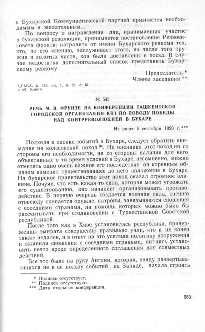 Речь М.В. Фрунзе на конференции Ташкентской городской организации КПТ по поводу победы над контрреволюцией в Бухаре. Не ранее 5 сентября 1920 г.