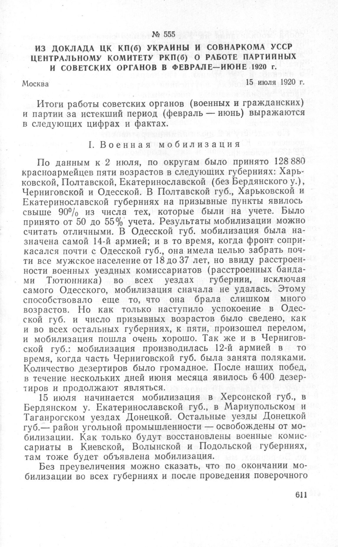 Из доклада ЦК КП(б) Украины и Совнаркома УССР Центральному Комитету РКП(б) о работе партийных и советских органов в феврале-июне 1920 г. Москва, 15 июля 1920 г. // ЦПА ИМЛ, ф. 17, оп. б/№, д. 23, лл. 14-15, 16-17, 18, 21 и об., 24 об. Подлинник.