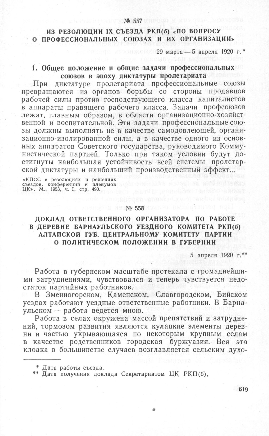 Доклад Ответственного организатора по работе в деревне Барнаульского уездного комитета РКП(б) Алтайской губ. Центральному Комитету партии о политическом положении в губернии. 5 апреля 1920 г. // ЦПА ИМЛ, ф. 17, оп. 5. д. 3, л. 8 и об. Подлинник.