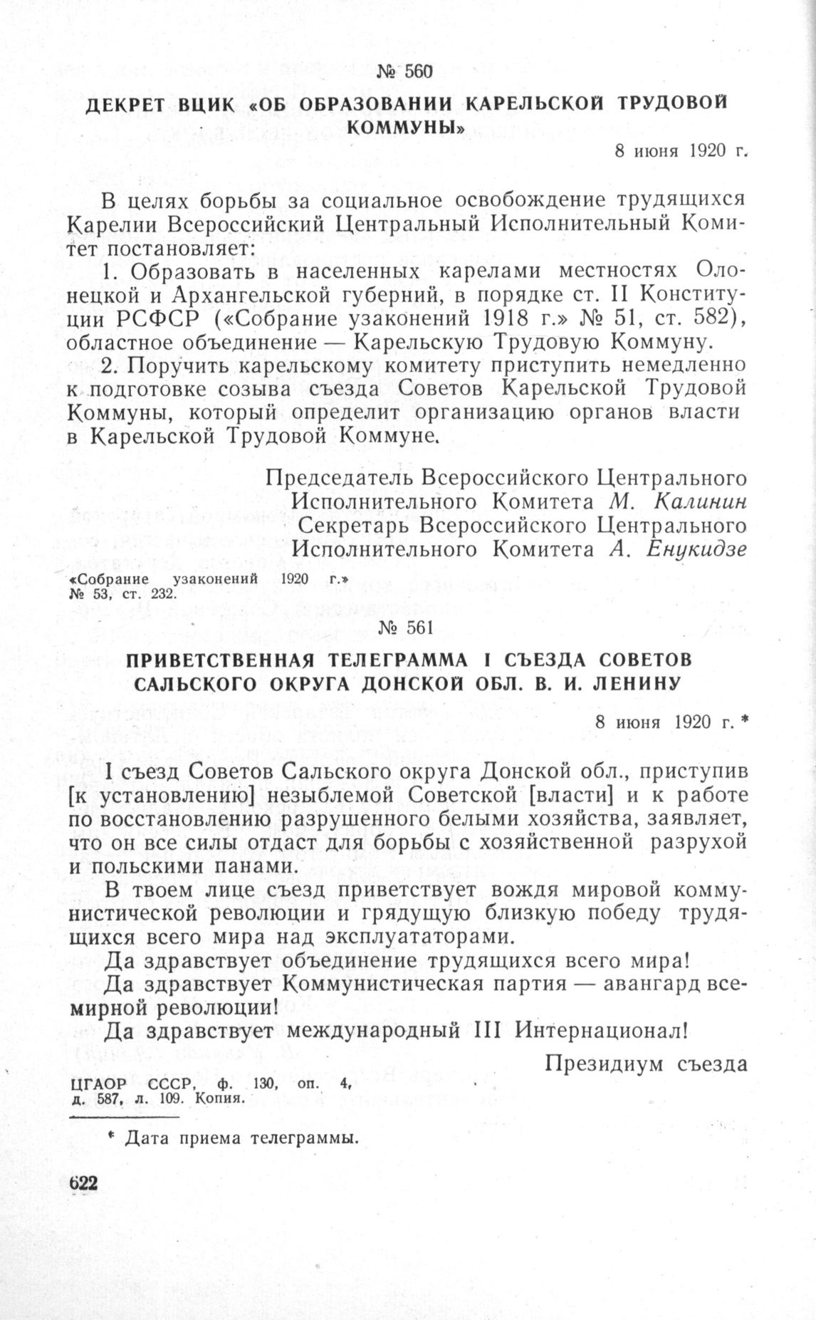 Декрет ВЦИК «Об образовании Карельской Трудовой Коммуны». 8 июня 1920 г. // «Собрание узаконений 1920 г.» № 53, ст. 232.