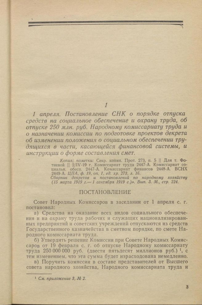 1 апреля. Постановление СНК о порядке отпуска средств на социальное обеспечение и охрану труда, об отпуске 250 млн. руб. Народному комиссариату труда и о назначении комиссии по подготовке проектов декрета об изменении положения о социальном обеспечении трудящихся в части, касающейся финансовой системы, и инструкции о форме составления смет // Копия; пометки: Секр. копия. Прот. 273, п. 5 || Для т. Фотиевой || 2/IV-19 г. Комиссариат труда 2447-А. Комиссариат социальн. обесп. 2447-А. Комиссариат финансов 2448-А. ВСНХ 2449-А. ЦПА, ф. 19, оп. 1, ед. хр. 273, л. 16. «Сборник декретов и постановлений по народному хозяйству (15 марта 1919 г.— 1 сентября 1919 г.)». Вып. 3. М., стр. 224.