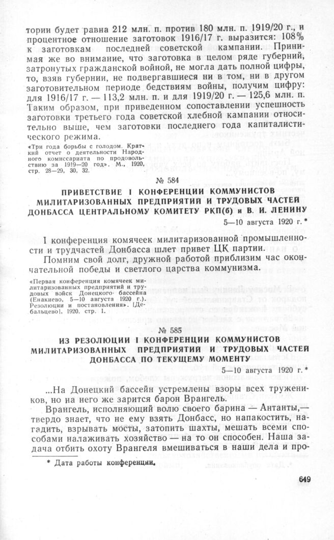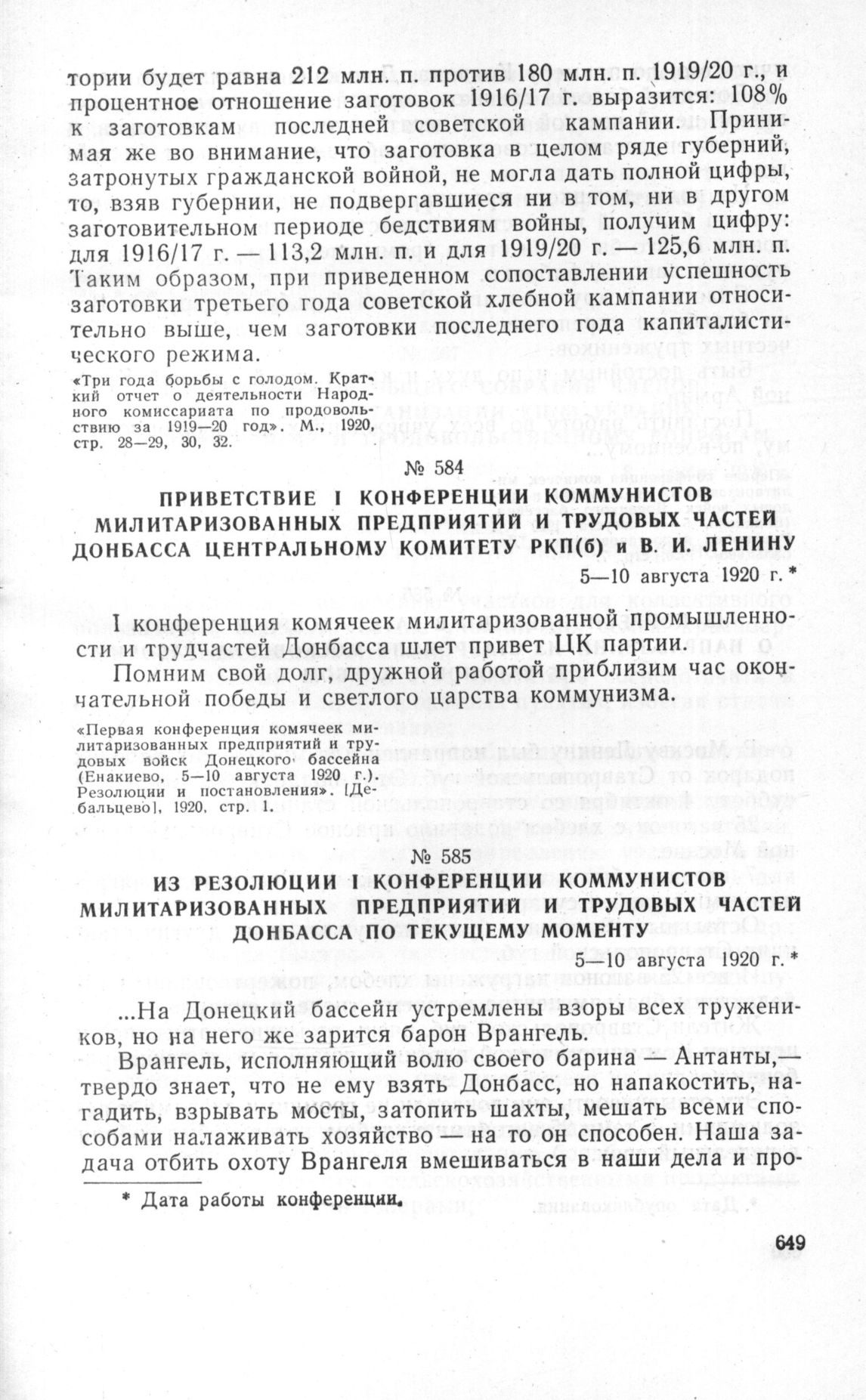 Приветствие I конференции коммунистов милитаризованных предприятий и трудовых частей Донбасса Центральному Комитету РКП(б) и В.И. Ленину. 5-10 августа 1920 г. // «Первая конференция комячеек милитаризованных предприятий и трудовых войск Донецкого бассейна (Енакиево, 5-10 августа 1920 г.). Резолюции и постановления». [Дебальцево], 1920, стр. 1.