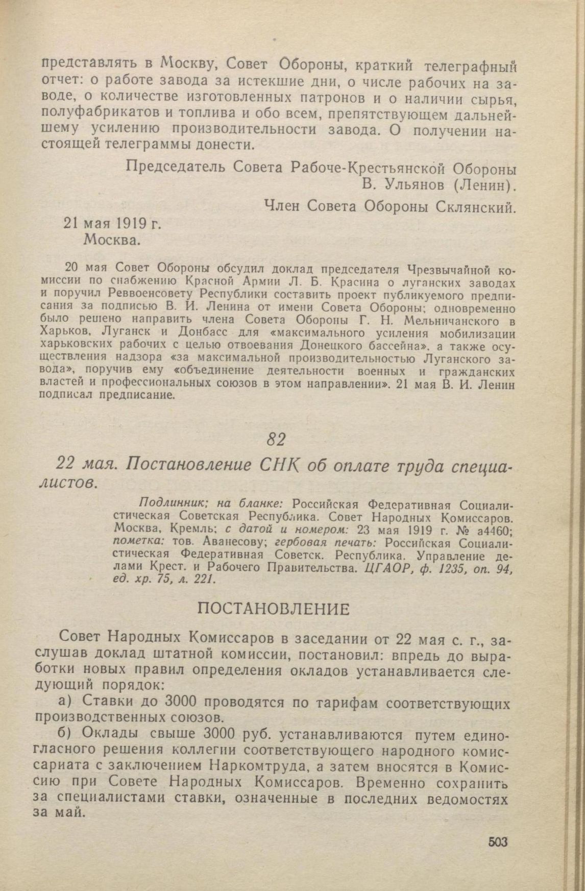 22 мая. Постановление СНК об оплате труда специалистов // Подлинник; на бланке: Российская Федеративная Социалистическая Советская Республика. Совет Народных Комиссаров. Москва, Кремль; с датой и номером: 23 мая 1919 г. № а4460; пометка: тов Аванесову; гербовая печать: Российская Социалистическая Федеративная Советск. Республика. Управление делами Крест. и Рабочего Правительства. ЦГАОР, ф. 1235, оп. 94, ед. хр. 75, л. 221.