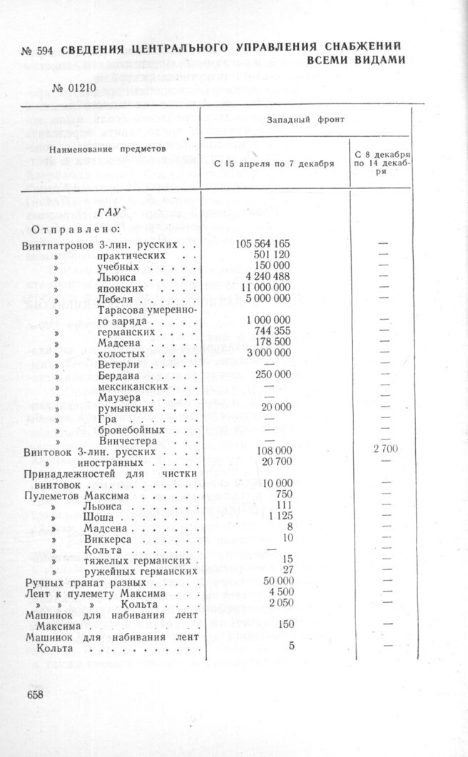 Сведения Центрального Управления снабжений Красной армии о снабжении фронтов и Запасной армии всеми видами довольствия в 1920 г. 15 декабря 1920 г. // ЦПА ИМЛ, ф. 19, оп. 3, д. 116, лл. 111-114, Подлинник.