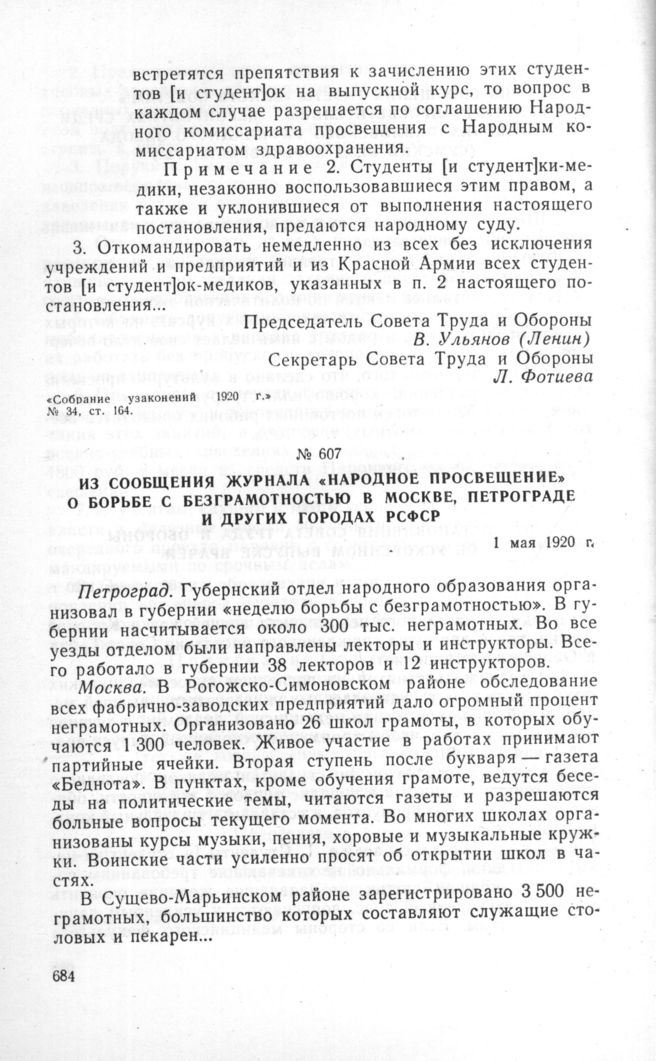 Из сообщения журнала «Народное просвещение» о борьбе с безграмотностью в Москве, Петрограде и других городах РСФСР. 1 мая 1920 г. // Журн. «Народное просвещение» № 59-61, 1 мая 1920 г., стр. 13.