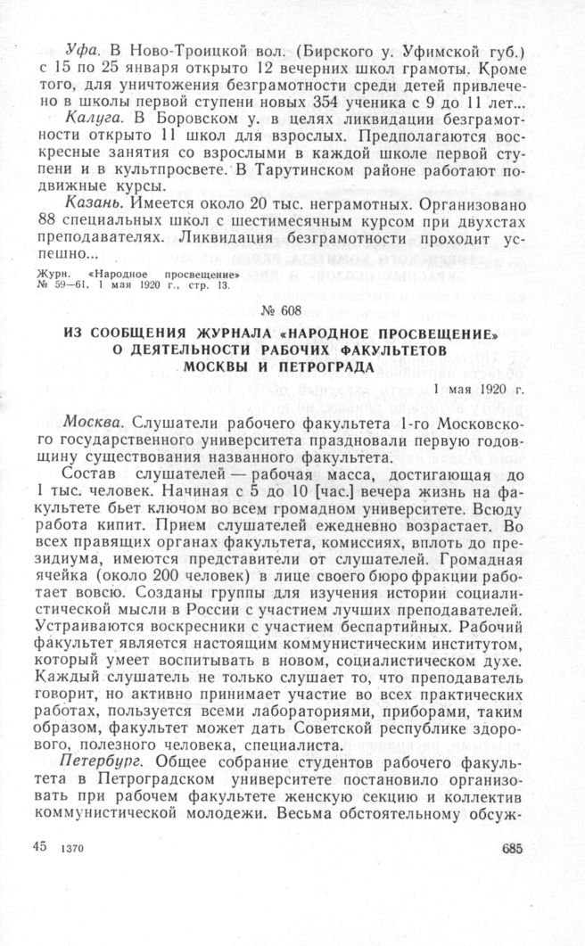 Из сообщения журнала «Народное просвещение» о деятельности рабочих факультетов Москвы и Петрограда. 1 мая 1920 г. // Журн. «Народное просвещение» № 59-61, 1 мая 1920 г., стр. 11.