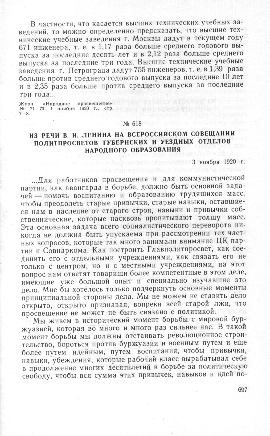 Из речи В.И. Ленина на Всероссийском совещании политпросветов губернских и уездных отделов народного образования. 3 ноября 1920 г. // В.И. Ленин. Соч., т. 31, стр. 340-341.