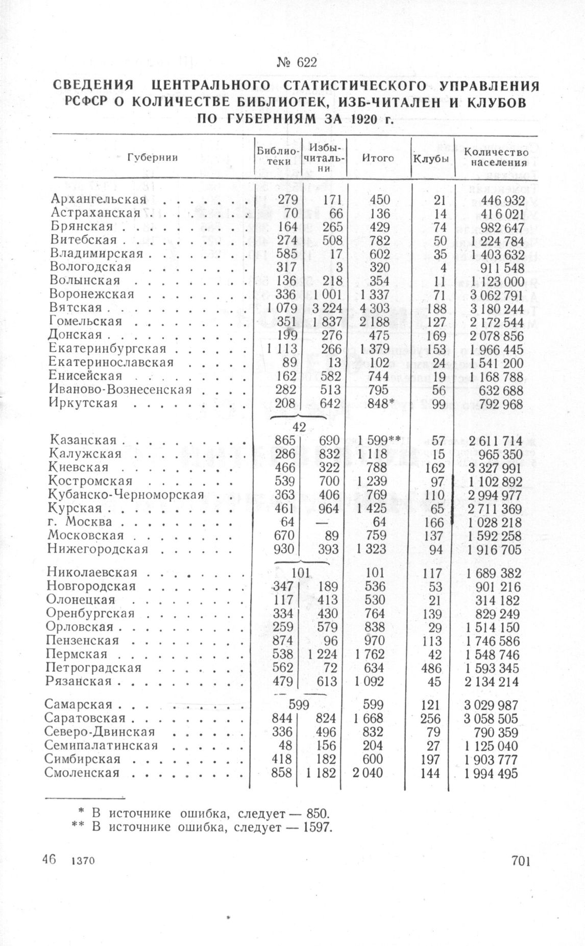 Сведения Центрального статистического управления РСФСР о количестве библиотек, изб-читален и клубов по губерниям за 1920 г. // Журн. «Бюллетень Центрального статистического управления» № 46, 5 апреля 1921 г., стр. 1.
