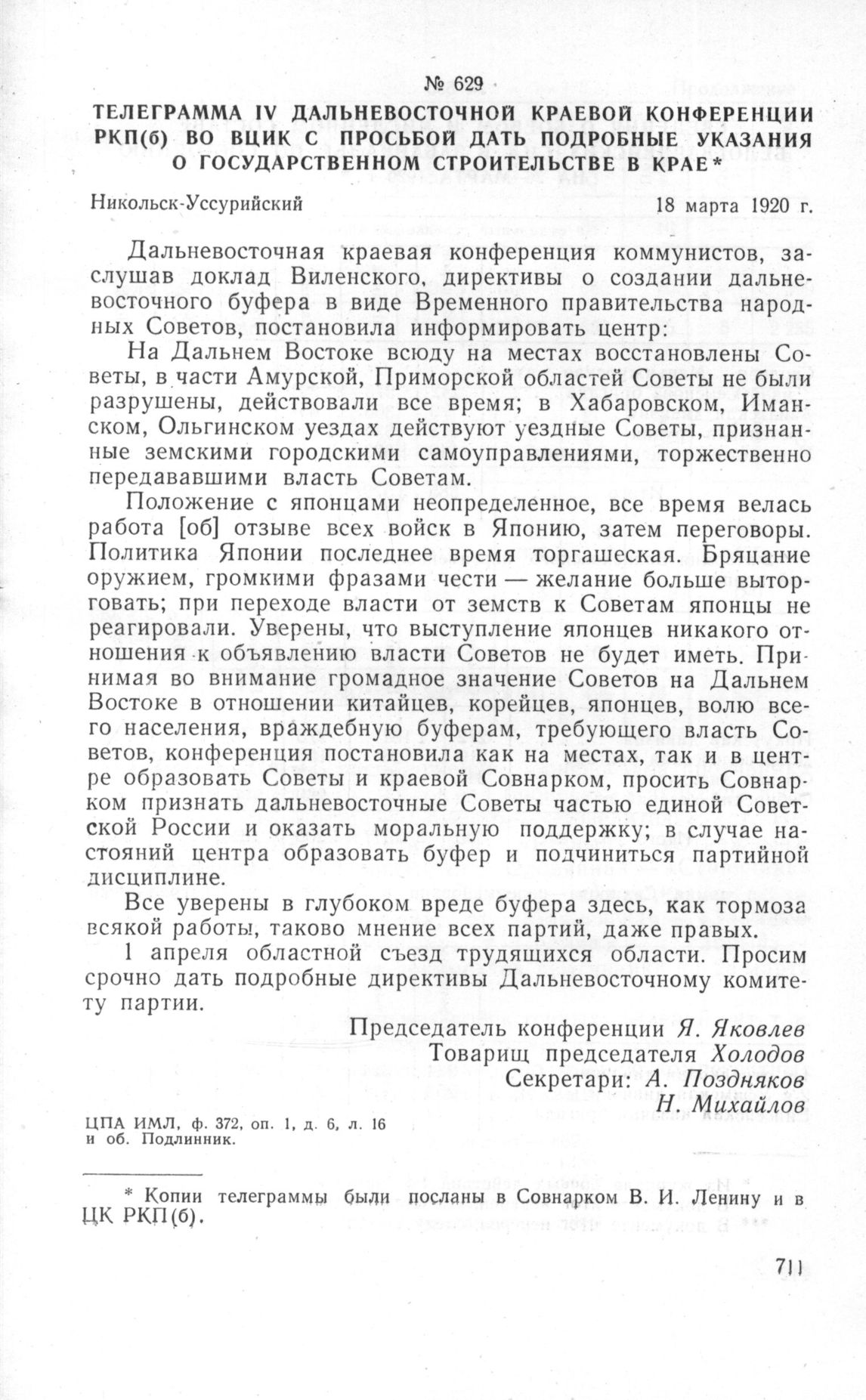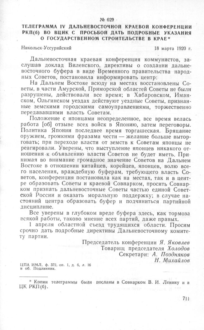Телеграмма IV Дальневосточной краевой конференции РКП(б) во ВЦИК с просьбой дать подробные указания о государственном строительстве в крае. Никольск-Уссурийский, 18 марта 1920 г. // ЦПА ИМЛ, ф. 372, оп. 1, д. 6, л. 16 и об. Подлинник.