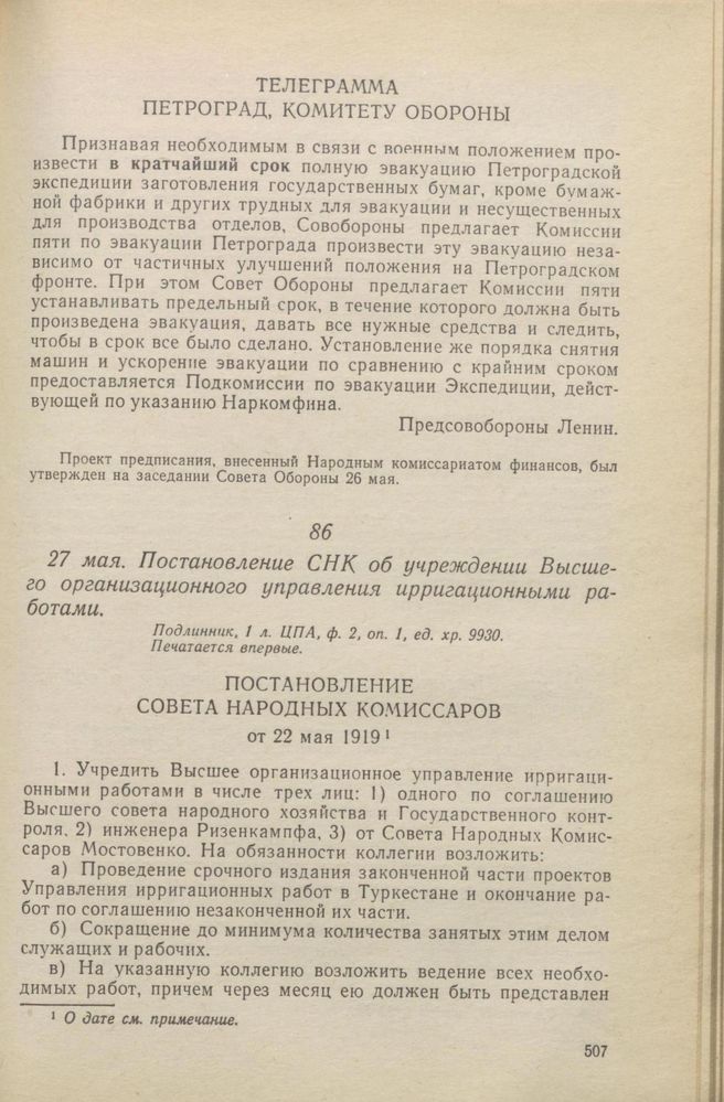 Главная Серия «Экономическая история. Документы, исследования, переводы» Декреты советской власти в 18 т. Декреты Советской власти. Т. V. 1 апреля – 31 июля 1919 г. Документы 27 мая. Постановление СНК об учреждении Высшего организационного у...