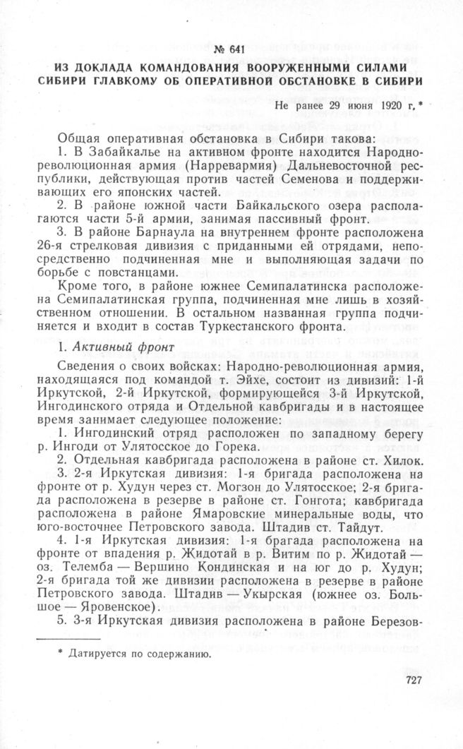 Из доклада командования вооруженными силами Сибири Главкому об оперативной обстановке в Сибири. Не ранее 29 июня 1920 г. // ЦГАСА, ф. 33988, оп. 2, д. 193, лл. 1-2. Подлинник.