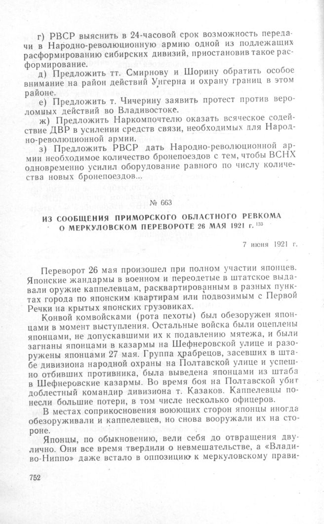Из сообщения Приморского областного Ревкома о меркуловском перевороте 26 мая 1921 г. 7 июня 1921 г. // «Борьба за власть Советов в Приморье (1917—1924 гг.)». Сб. док., Владивосток, 1955, стр. 623-626.