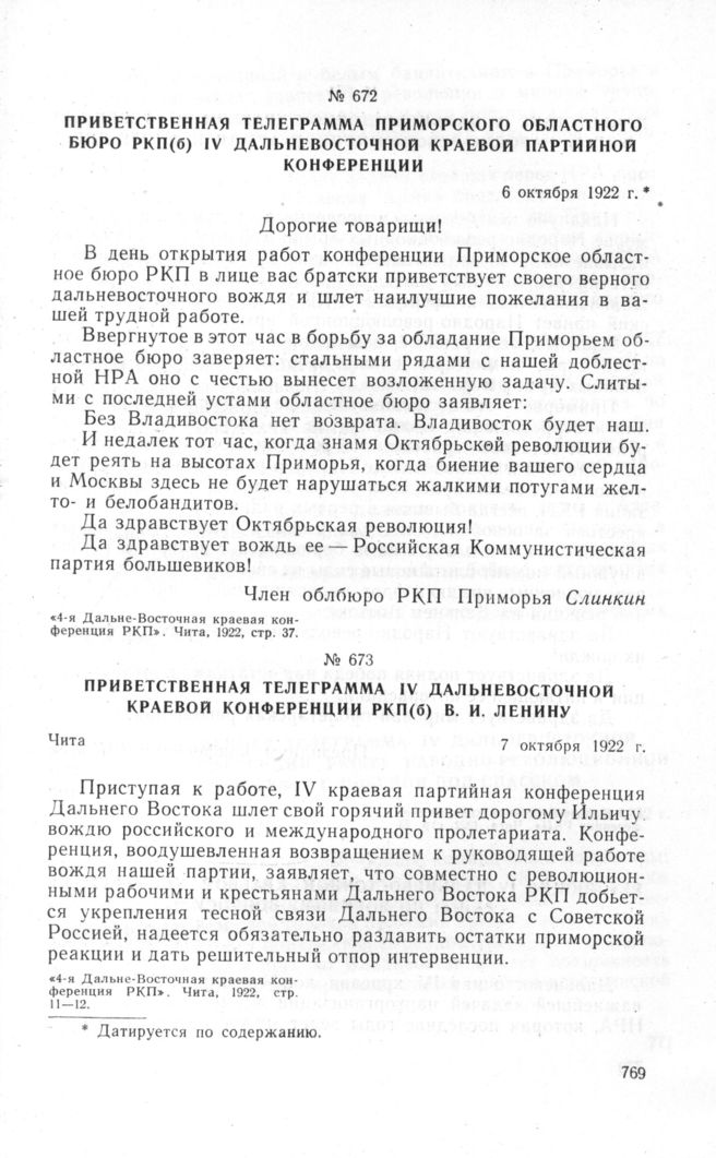 Приветственная телеграмма Приморского областного бюро РКП(б) IV Дальневосточной краевой партийной конференции. 6 октября 1922 г. // «4-я Дальне-Восточная краевая конференция РКП». Чита, 1922, стр. 37.