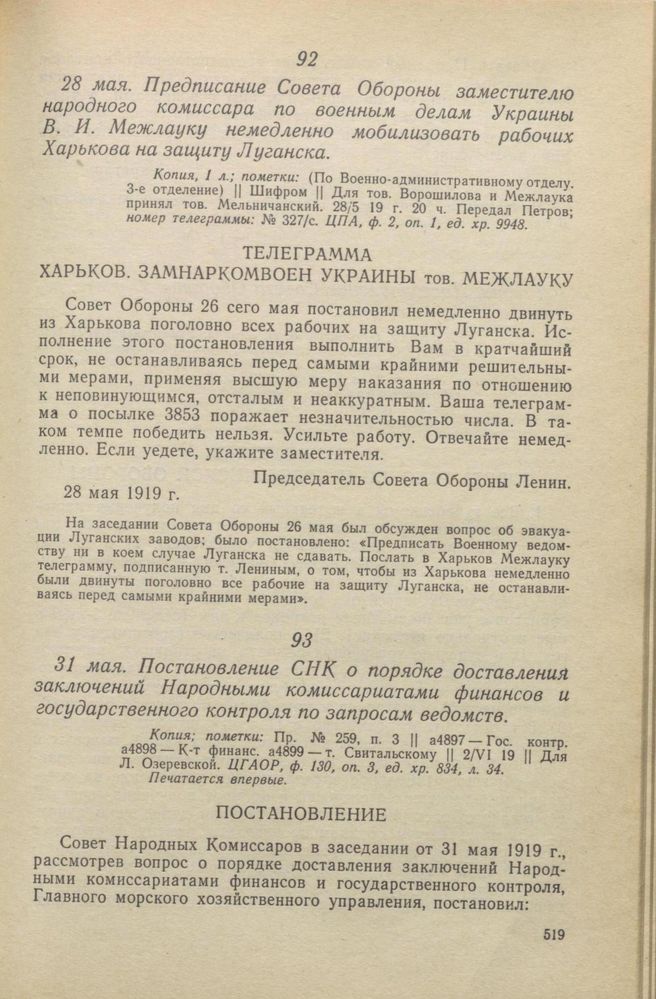 28 мая. Предписание Совета Обороны заместителю народного комиссара по военным делам Украины В. И. Межлауку немедленно мобилизовать рабочих Харькова на защиту Луганска // Копия, 1 л.; пометки: (По Военно-административному отделу. 3-е отделение) || Шифром || Для тов. Ворошилова и Межлаука принял тов. Мельничанский. 28/5 19 г. 20 ч. Передал Петров; номер телеграммы: № 327/с. ЦПА, ф. 2, оп. 1, ед. хр. 9948.