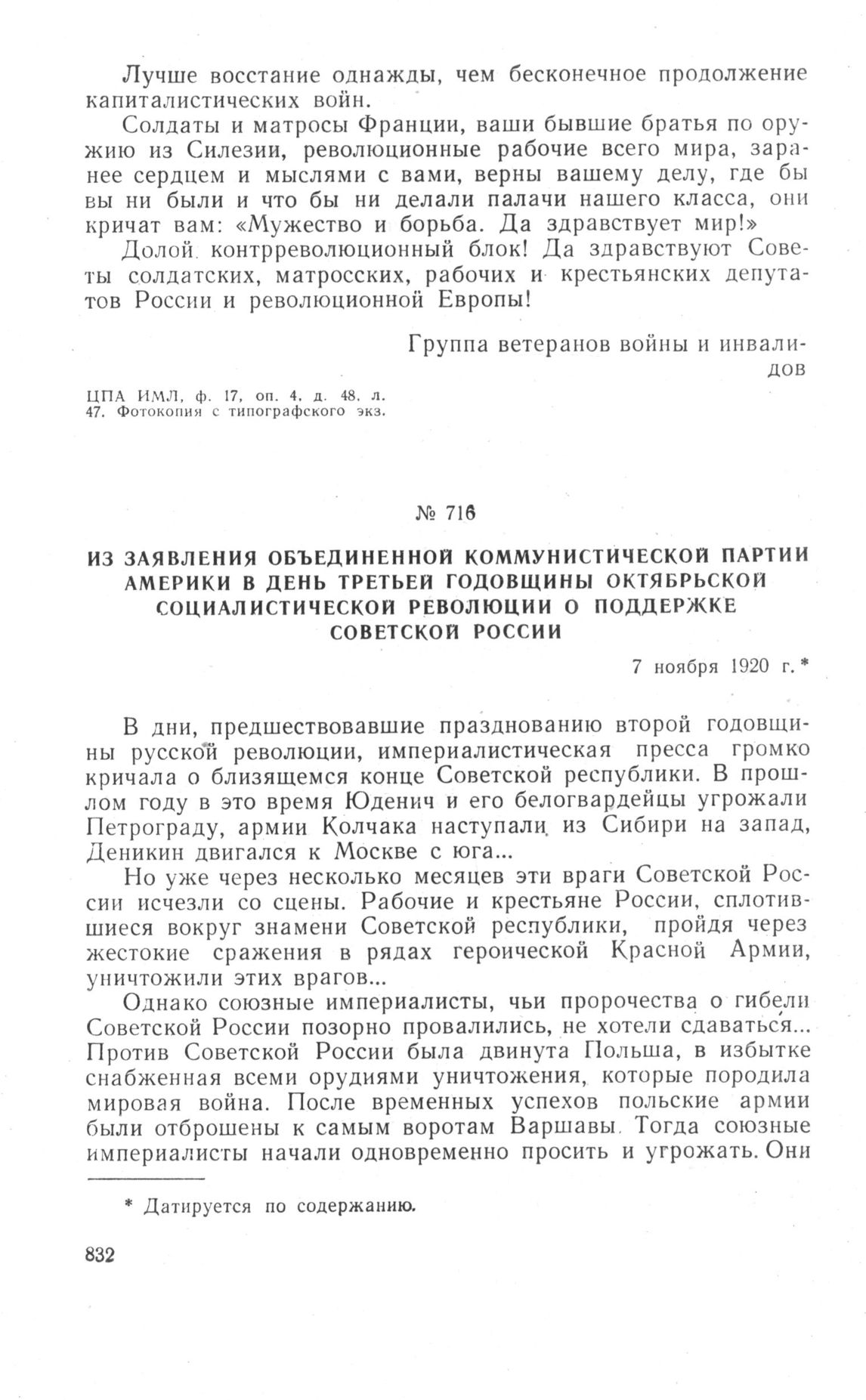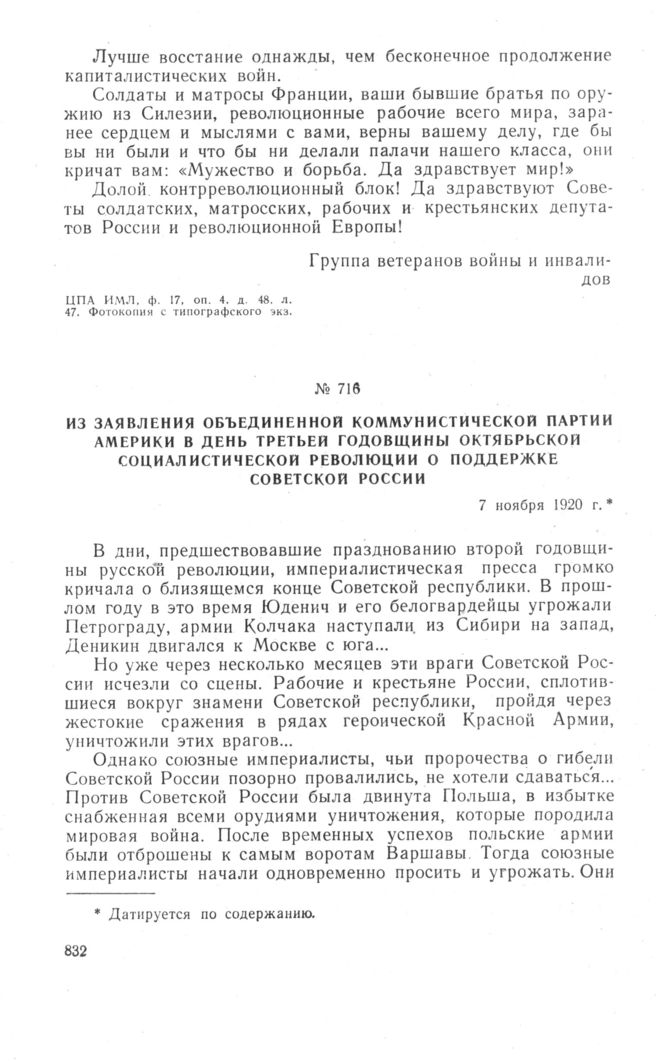Из заявления Объединенной Коммунистической партии Америки в день третьей годовщины Октябрьской социалистической революции о поддержке Советской России. 7 ноября 1920 г.