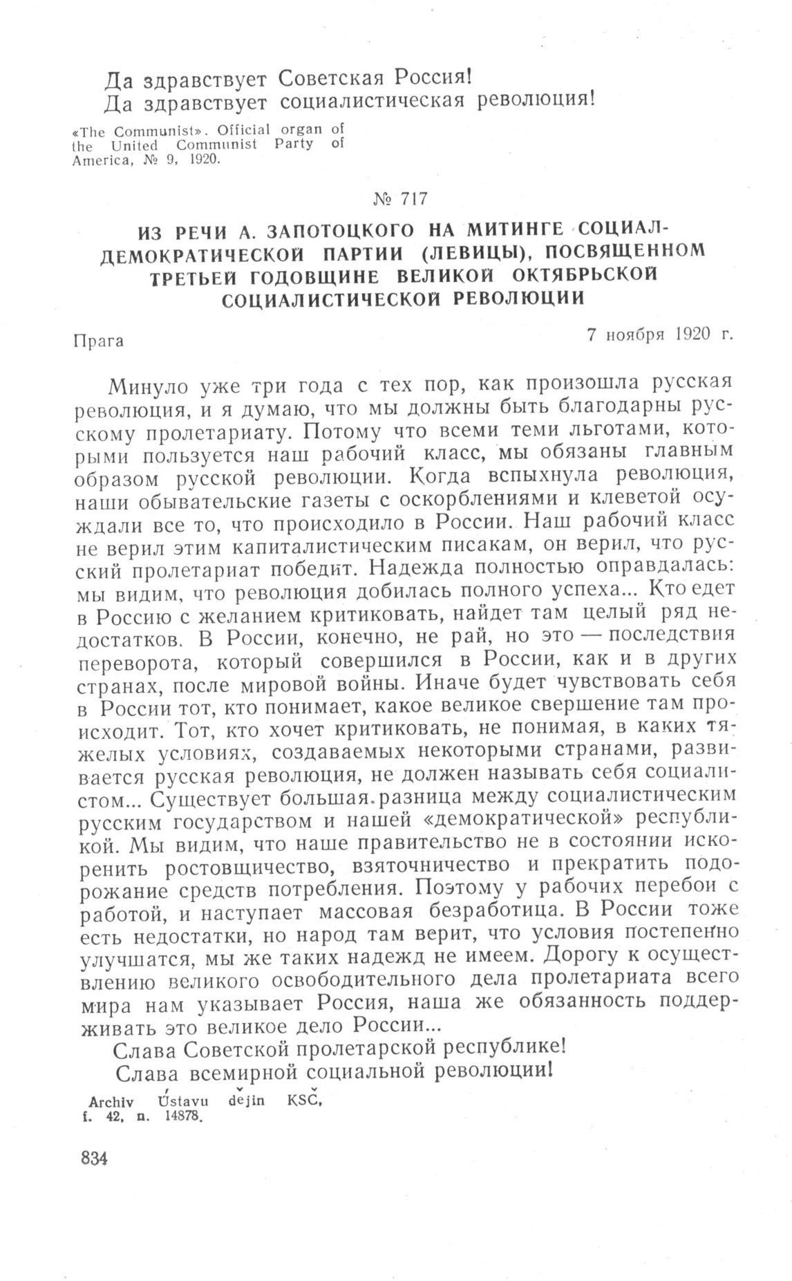 Из речи А. Запотоцкого на митинге Социал-Демократической партии (левицы), посвященном третьей годовщине Великой Октябрьской социалистической революции. Прага, 7 ноября 1920 г. // Archiv Ústavu dějin KSČ, f. 42. n. 14878.