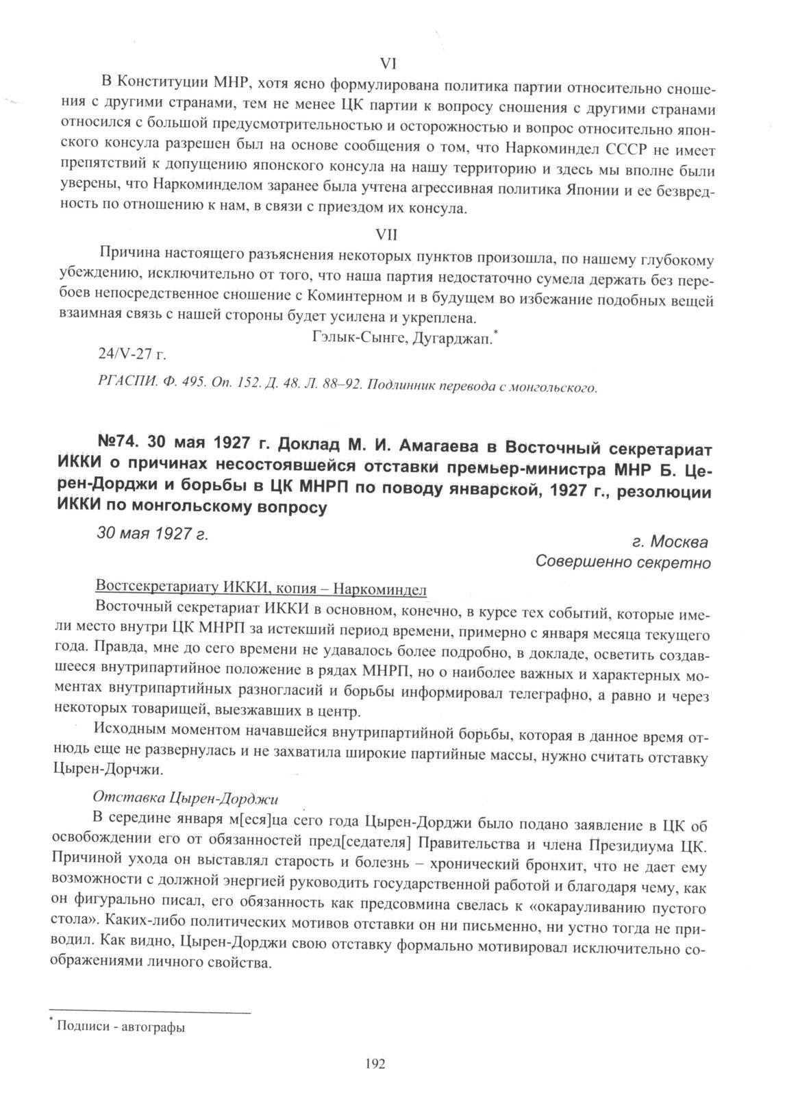 Доклад М.И. Амагаева в Восточный секретариат ИККИ о причинах несостоявшейся отставки премьер-министра МНР Б. Церен-Дорджи и борьбы в ЦК МНРП по поводу январской, 1927 г., резолюции ИККИ по монгольскому вопросу. г. Москва. 30 мая 1927 г.