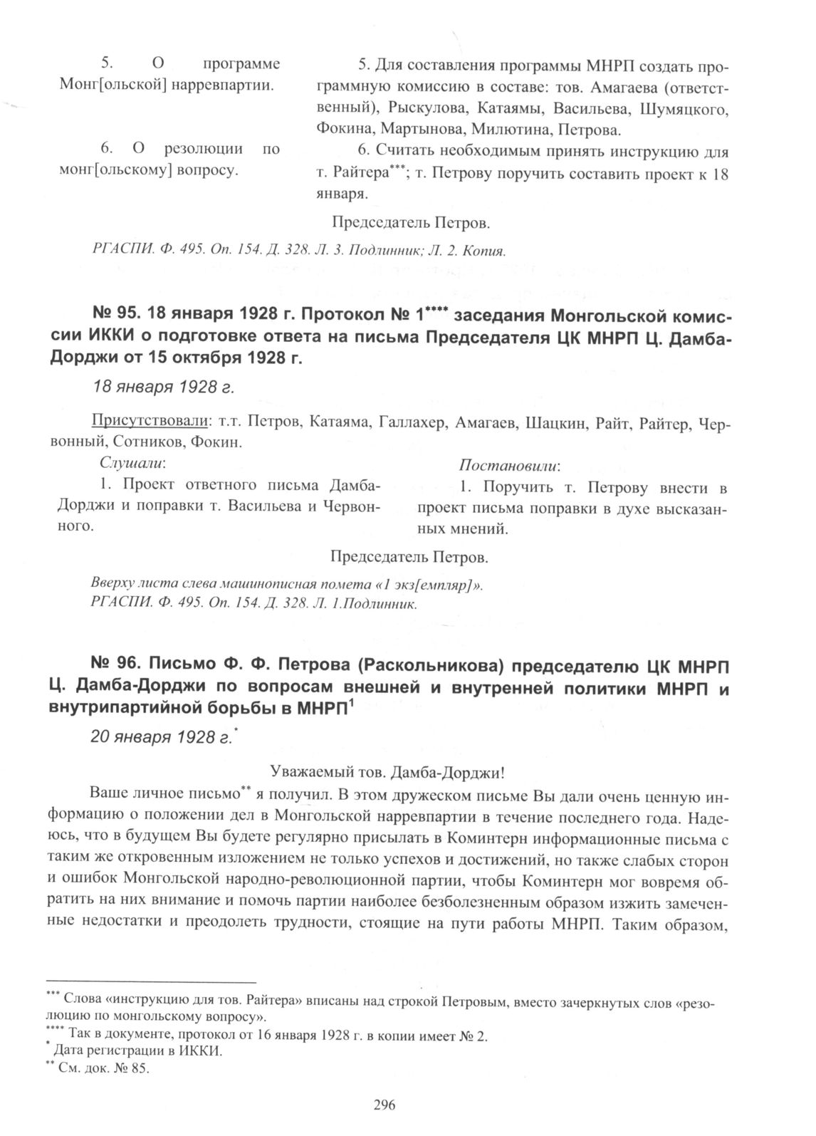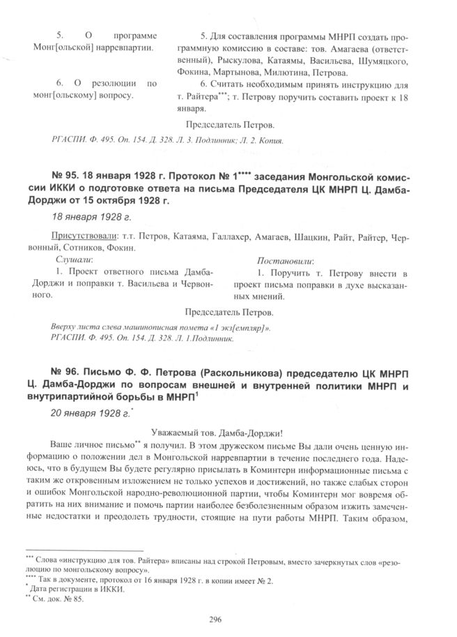 Письмо Ф.Ф. Петрова (Раскольникова) председателю ЦК МНРП Ц. Дамба-Дорджи по вопросам внешней и внутренней политики МНРП и внутрипартийной борьбы в МНРП. 20 января 1928 г. // РГАСПИ. Ф. 495. Оп. 152. Д. 62. Л. 72-78. Подлинник.