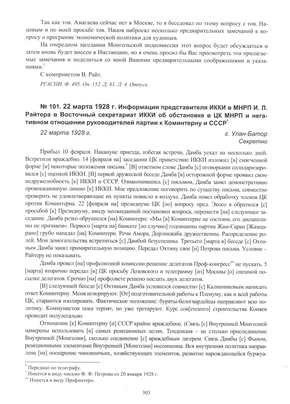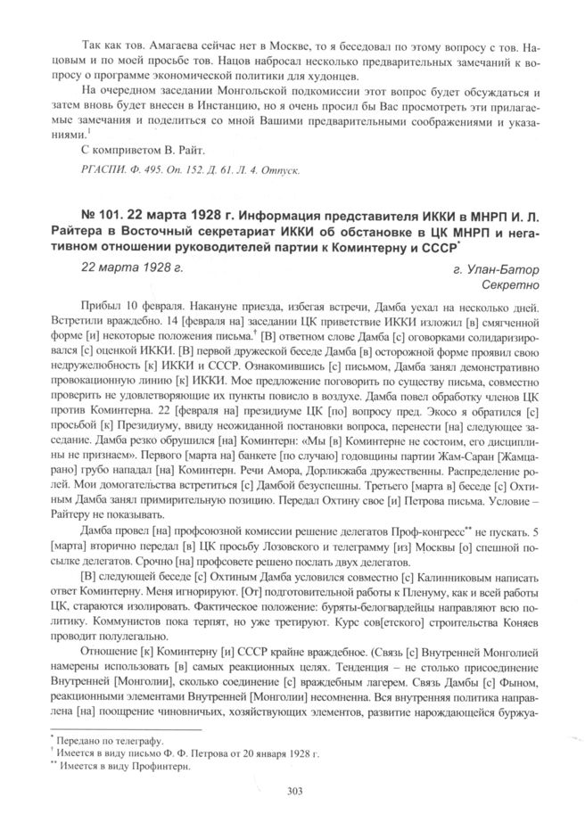 Информация представителя ИККИ в МНРП И.Л. Райтера в Восточный секретариат ИККИ об обстановке в ЦК МНРП и негативном отношении руководителей партии к Коминтерну и СССР. г. Улан-Батор. 22 марта 1928 г. // РГАСПИ. Ф. 495. Оп. 152. Д. 64. Л. 21-23. Копия.