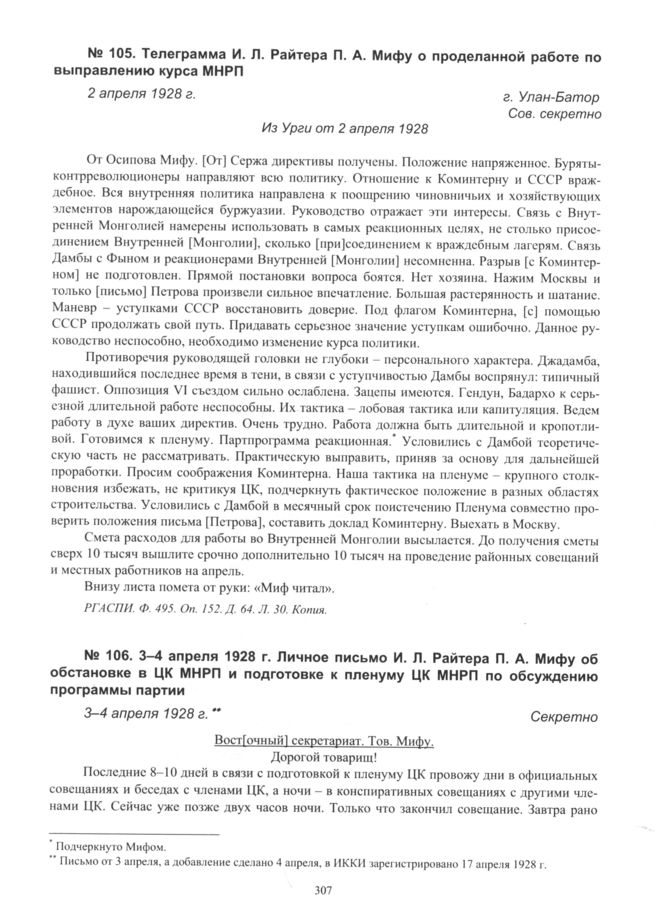 Телеграмма И.Л. Райтера П.А. Мифу о проделанной работе по выправлению курса МНРП. г. Улан-Батор. 2 апреля 1928 г.