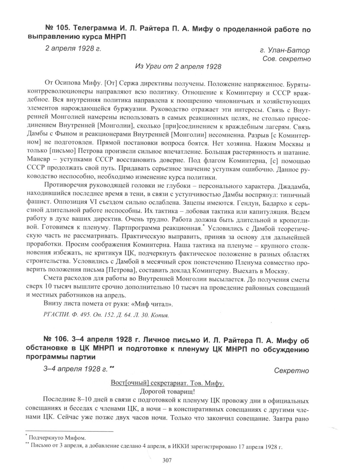 Телеграмма И.Л. Райтера П.А. Мифу о проделанной работе по выправлению курса МНРП. г. Улан-Батор. 2 апреля 1928 г. // РГАСПИ. Ф. 495. Оп. 152. Д. 64. Л. 30. Копия.