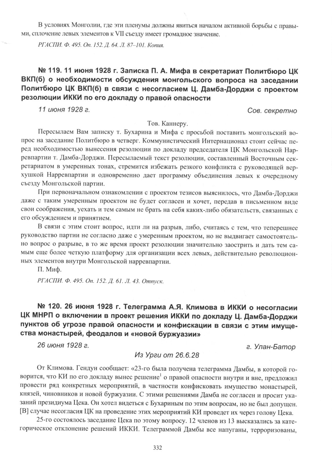 Записка П.А. Мифа в секретариат Политбюро ЦК ВКП(б) о необходимости обсуждения монгольского вопроса на заседании Политбюро ЦК ВКП(б) в связи с несогласием Ц. Дамба-Дорджи с проектом резолюции ИККИ по его докладу о правой опасности. 11 июня 1928 г.