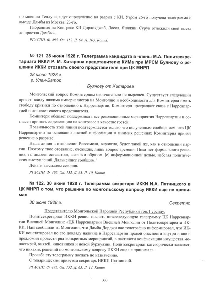 Телеграмма секретаря ИККИ И.А. Пятницкого в ЦК МНРП о том, что решение по монгольскому вопросу ИККИ еще не принимал. 30 июня 1928 г. // РГАСПИ. Ф. 495. Оп. 152. Д. 63. Л. 14. Копия.