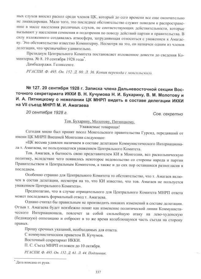 Записка члена Дальневосточной секции Восточного секретариата ИККИ В.Н. Кучумова Н.И. Бухарину, В.М. Молотову и И.А. Пятницкому о нежелании ЦК МНРП видеть в составе делегации ИККИ на VII съезд МНРП М.И. Амагаева. 20 сентября 1928 г. // РГАСПИ. Ф. 495. Оп. 152. Д. 61. Л. 44. Подлинник.