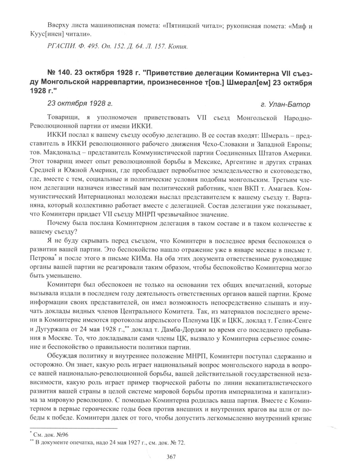 Приветствие делегации Коминтерна VII съезду Монгольской нарревпартии, произнесенное т[ов.] Шмерал[ем] 23 октября 1928 г. г. Улан-Батор. 23 октября 1928 г.