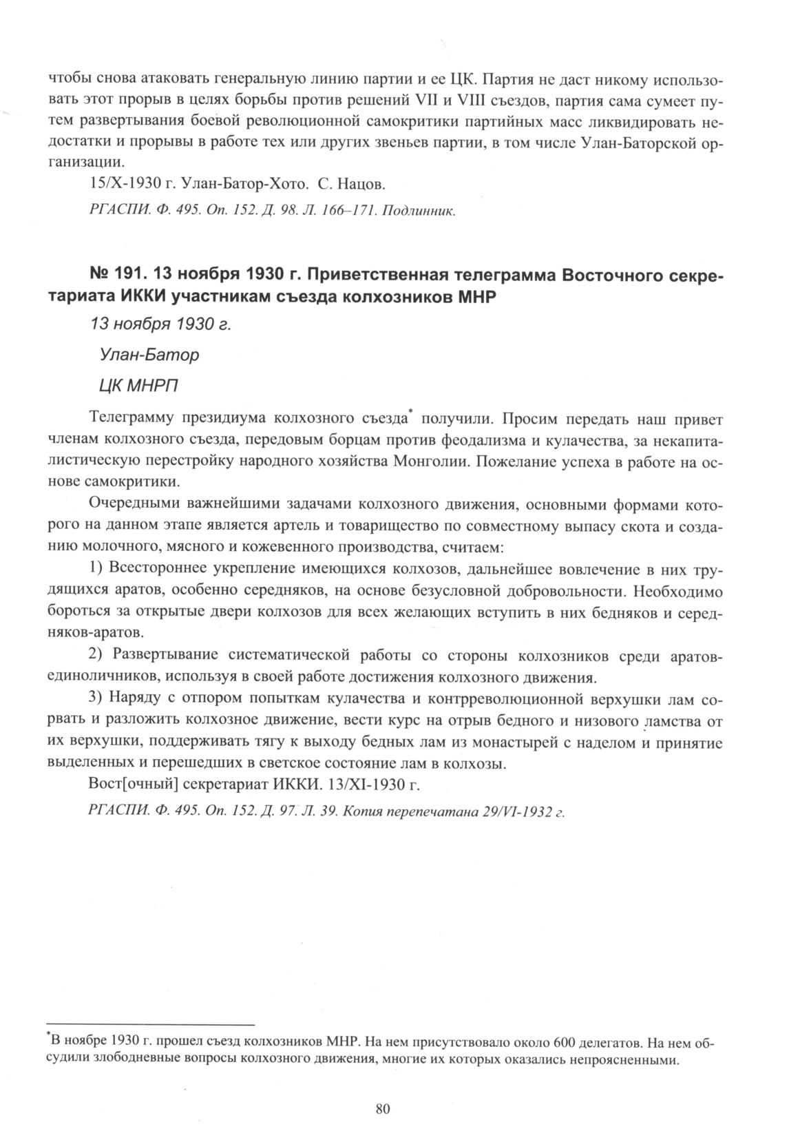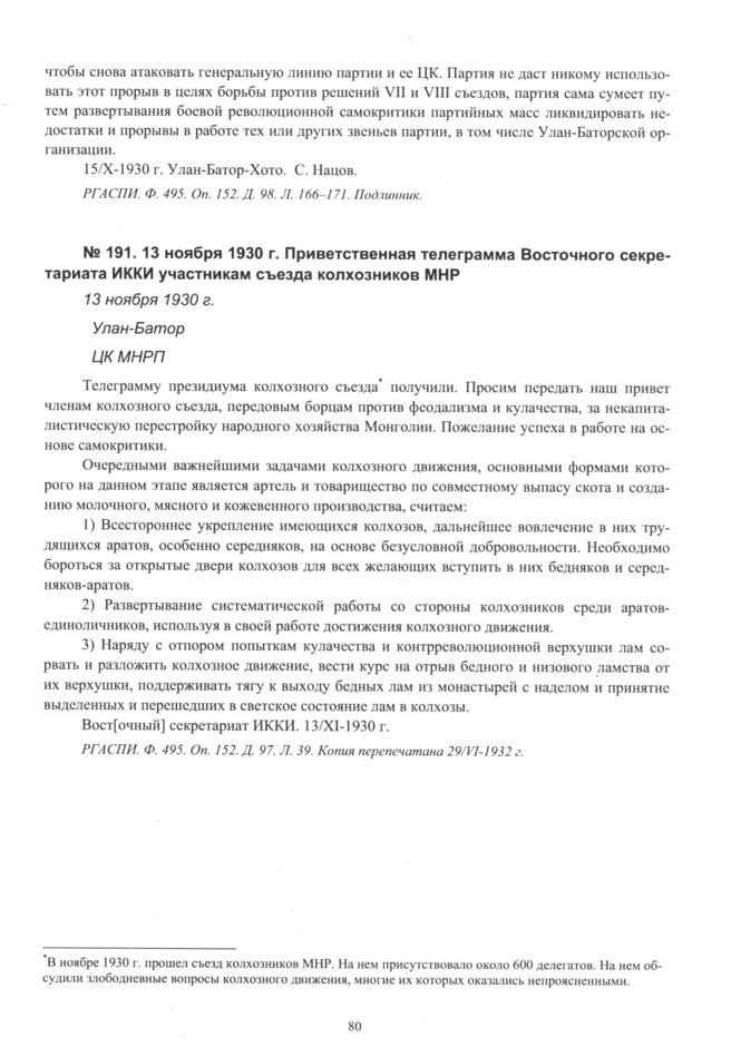 Приветственная телеграмма Восточного секретариата ИККИ участникам съезда колхозников МНР. Улан-Батор. 13 ноября 1930 г. // РГАСПИ. Ф. 495. Оп. 152. Д. 97. Л. 39. Копия перепечатана 29/VI-1932 г.