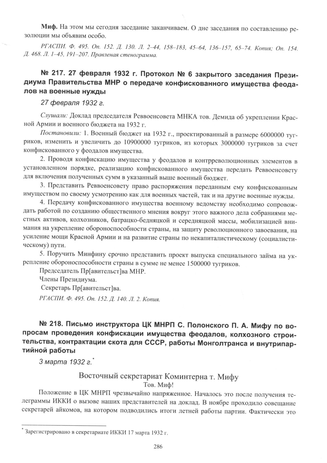 Протокол № 6 закрытого заседания Президиума Правительства МНР о передаче конфискованного имущества феодалов на военные нужды. 27 февраля 1932 г. // РГАСПИ. Ф. 495. Оп. 152. Д. 140. Л. 2. Копия.