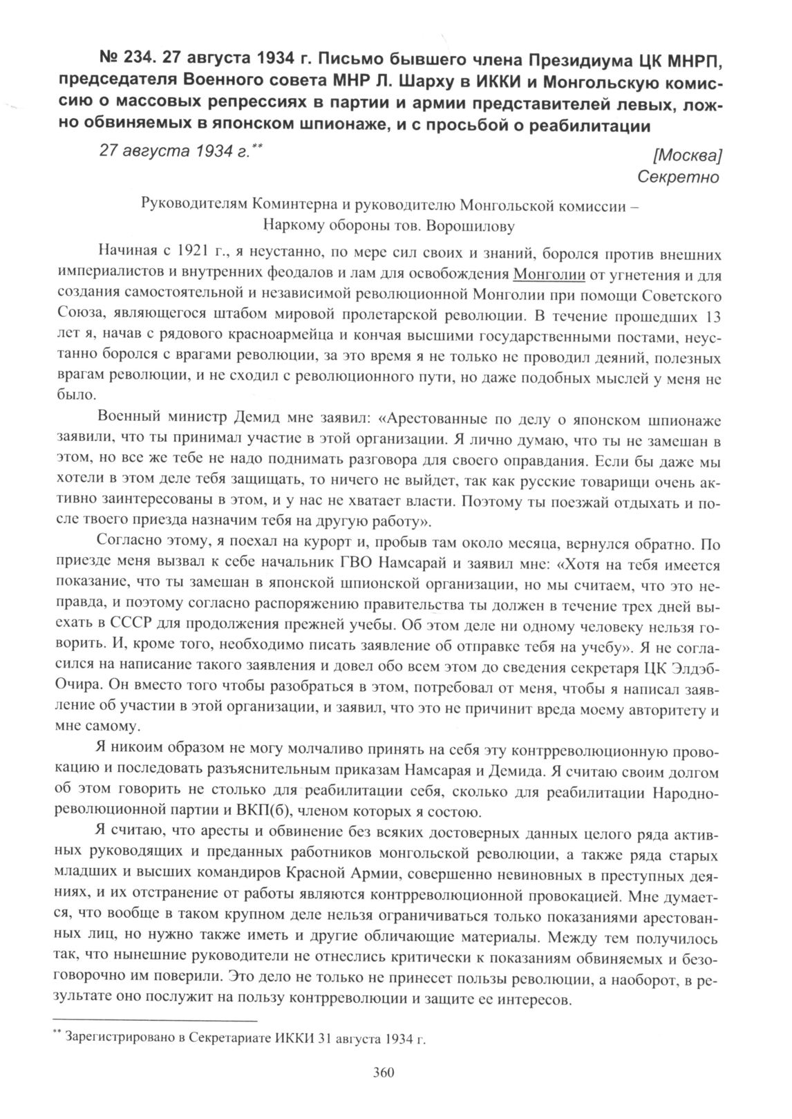 Письмо бывшего члена Президиума ЦК МНРП, председателя Военного совета МНР Л. Шарху в ИККИ и Монгольскую комиссию о массовых репрессиях в партии и армии представителей левых, ложно обвиняемых в японском шпионаже, и с просьбой о реабилитации. [Москва]. 27 августа 1934 г.