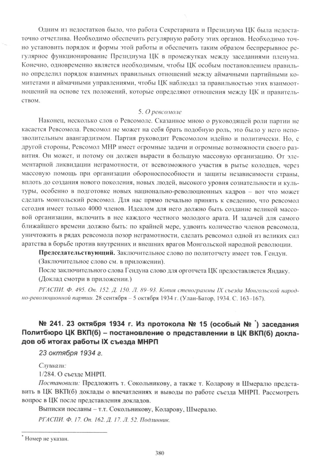 Из протокола № 15 (особый №) заседания Политбюро ЦК ВКП(б) - постановление о представлении в ЦК ВКП(б) докладов об итогах работы IX съезда МНРП. 23 октября 1934 г. // РГАСПИ. Ф. 17. Оп. 162. Д. 17. Л. 52. Подлинник.