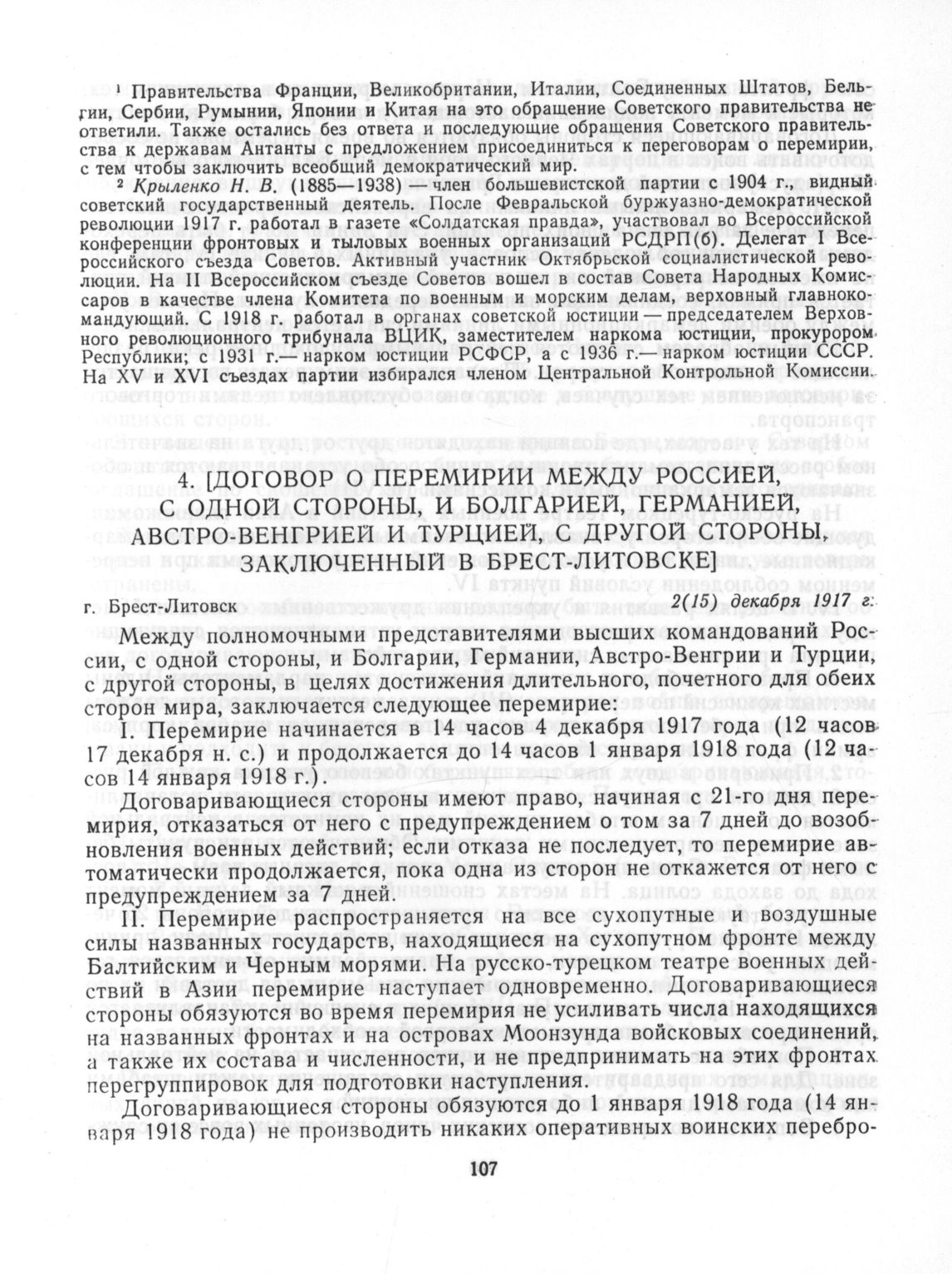 Договор о перемирии между Россией, с одной стороны, и Болгарией, Германией, Австро-Венгрией и Турцией, с другой стороны, заключенный в Брест-Литовске. 2 (15) декабря 1917 г. // Документы внешней политики СССР, т. 1, с. 47-51.