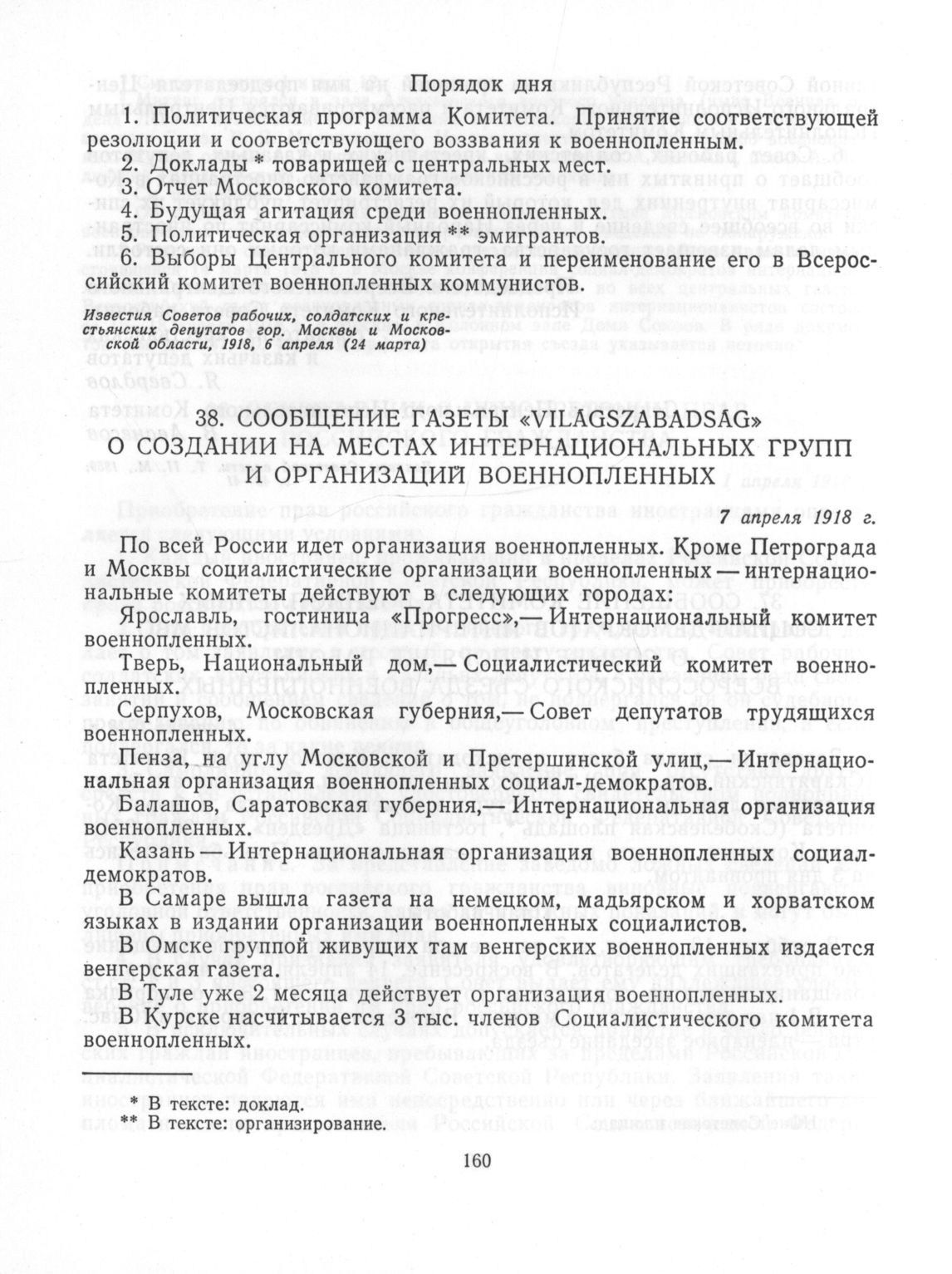 Сообщение газеты «Világszabadság» о создании на местах интернациональных групп и организаций военнопленных. 7 апреля 1918 г. // Világszabadság, 1918, Aprilis 7. Перевод с венгерского яз.