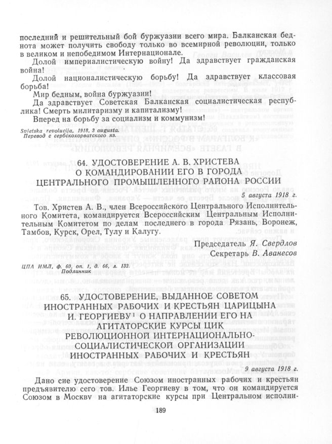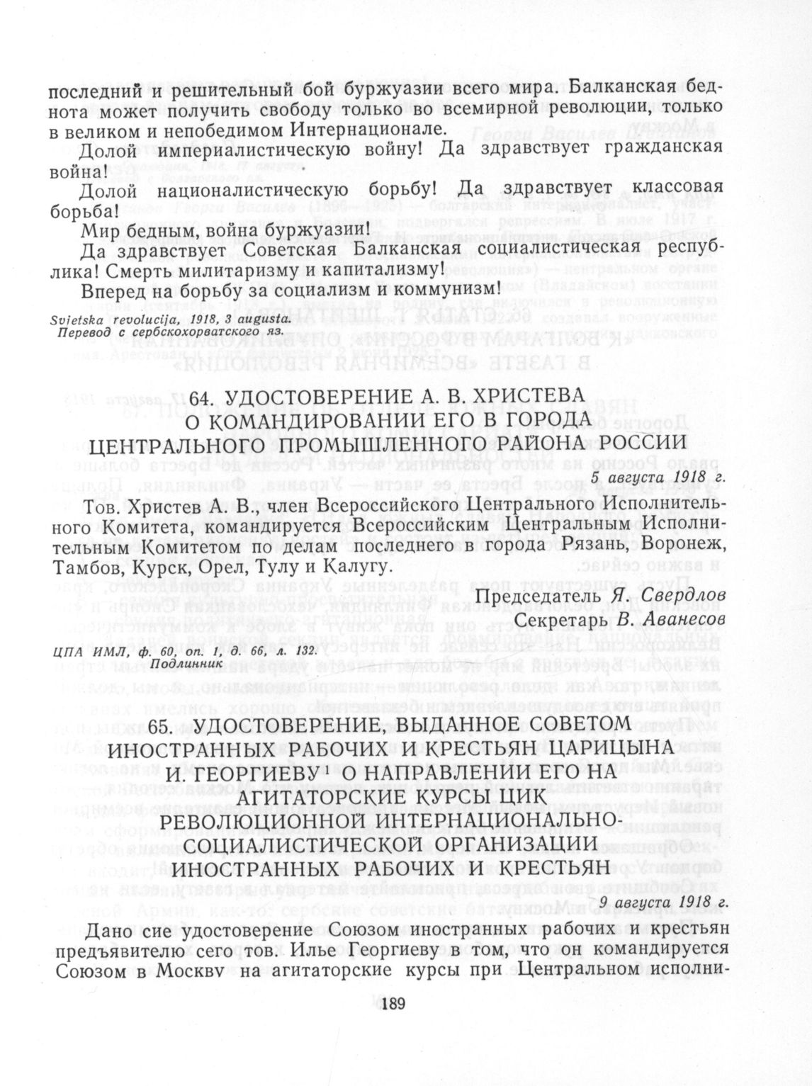 Удостоверение, выданное Советом иностранных рабочих и крестьян Царицына И. Георгиеву о направлении его на агитаторские курсы ЦИК Революционной интернационально-социалистической организации иностранных рабочих и крестьян. 9 августа 1918 г.