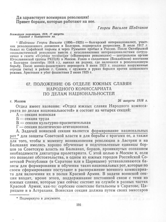 Положение об отделе южных славян Народного комиссариата по делам национальностей. 26 августа 1918 г. // ЦГАОР СССР, ф. 1318, оп. 1, д. 38, л. 8-9. Рукописный подлинник. Участие югославских трудящихся в Октябрьской революции и гражданской войне в СССР, с. 168-169.