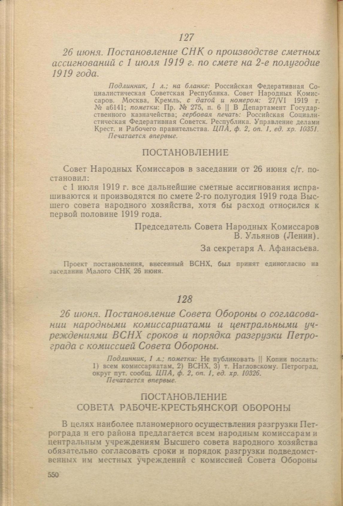 26 июня. Постановление СНК о производстве сметных ассигнований с 1 июля 1919 г. по смете на 2-е полугодие 1919 года // Подлинник, 1 л.; на бланке: Российская Федеративная Социалистическая Советская Республика. Совет Народных Комиссаров. Москва, Кремль, с датой и номером: 27/VI 1919 г. № а6141; пометки: Пр. № 275, п. 6 || В Департамент Государственного казначейства; гербовая печать: Российская Социалистическая Федеративная Советск. Республика. Управление делами Крест. и Рабочего правительства. ЦПА, ф. 2, оп. 1, ед. хр. 10351. Печатается впервые.