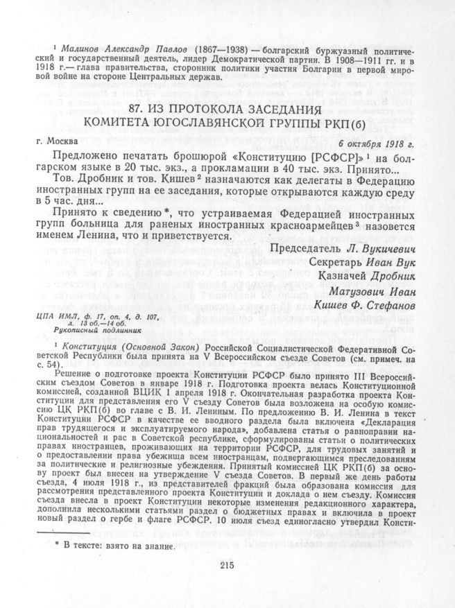 Из протокола заседания комитета Югославянской группы РКП(б). 6 октября 1918 г. // ЦПА ИМЛ, ф. 17, оп. 4, д. 107, л. 13 об.-14 об. Рукописный подлинник.